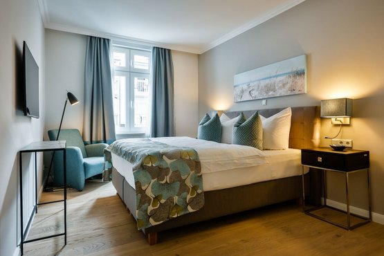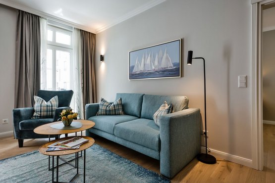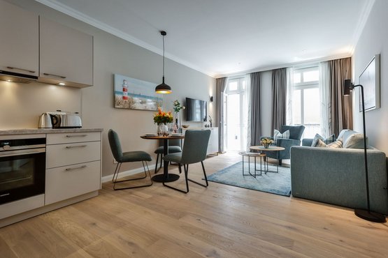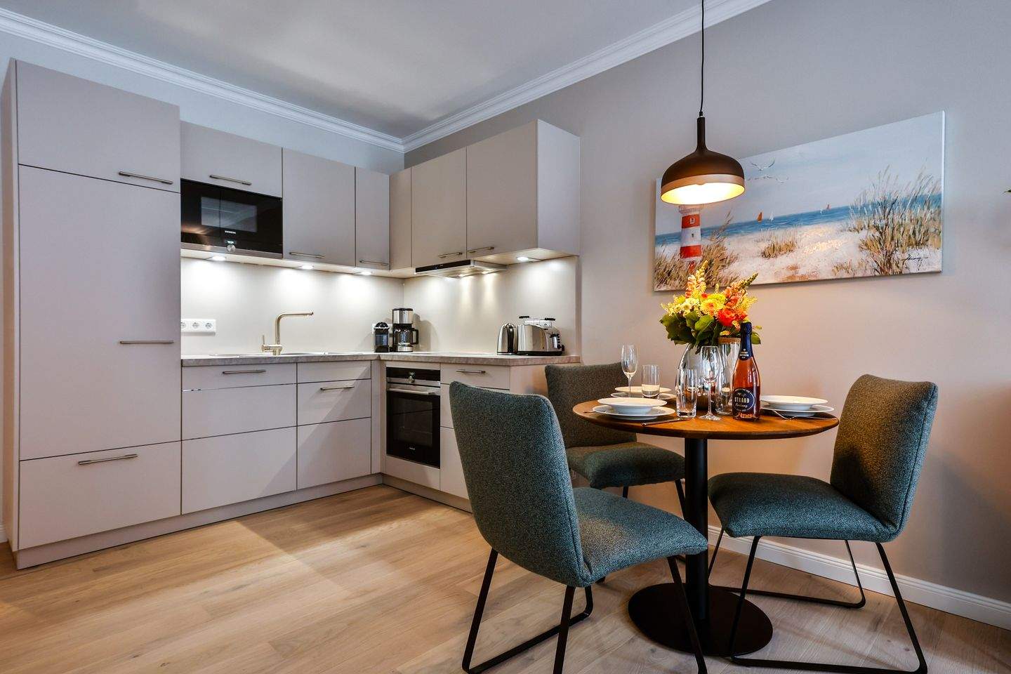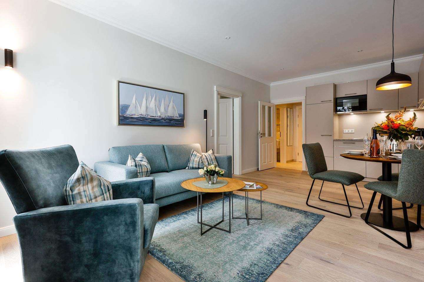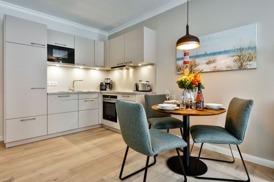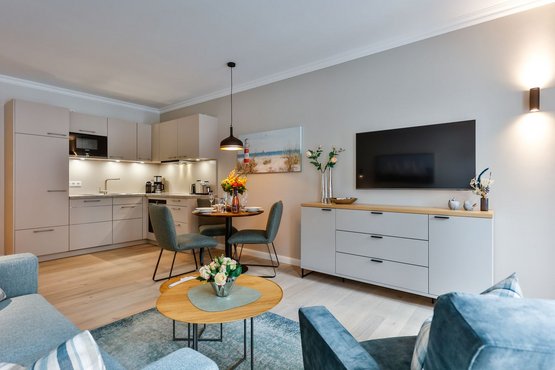 Moderne 2-Zimmer Ferienwohnung im 1. OG im Logierhaus Jonna mit 56 m² für 2 Personen in zentraler und trotzdem ruhiger Lage in Westerland, nur ca. 50 m von der Einkaufsmeile Friedrichstraße und ca. 200 m von der Strandpromenade entfernt.