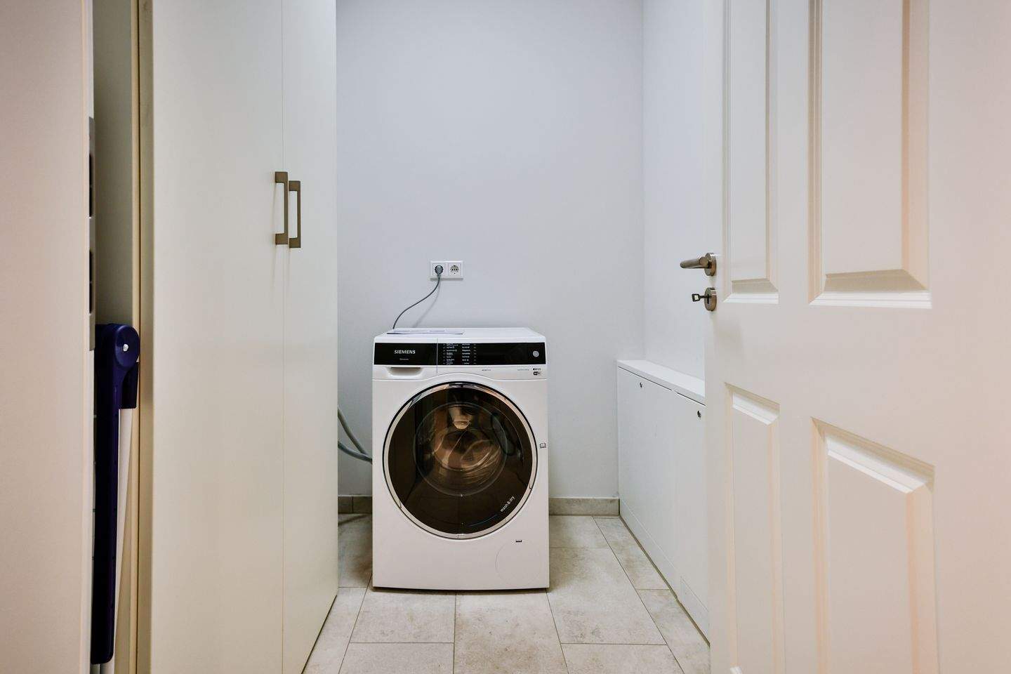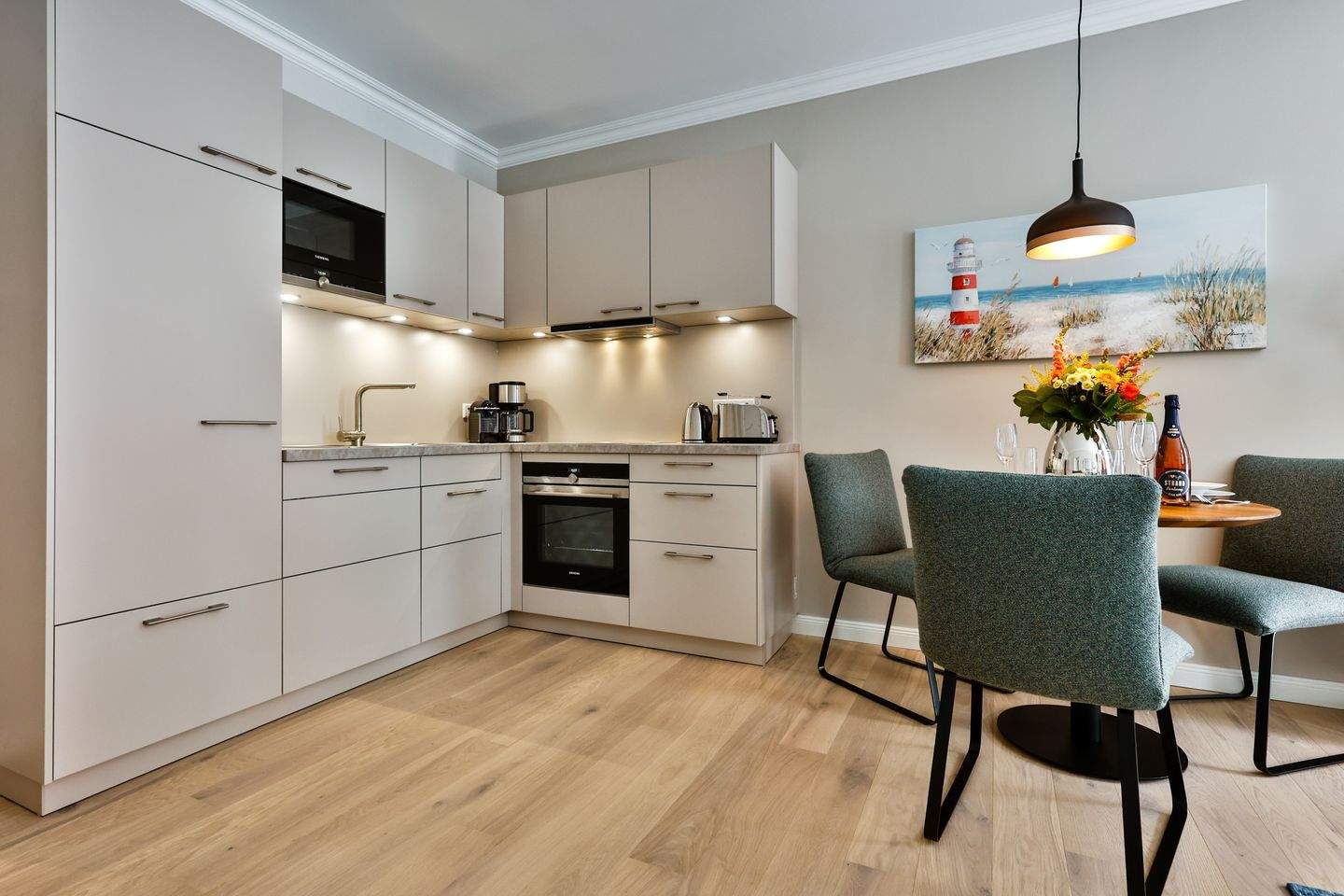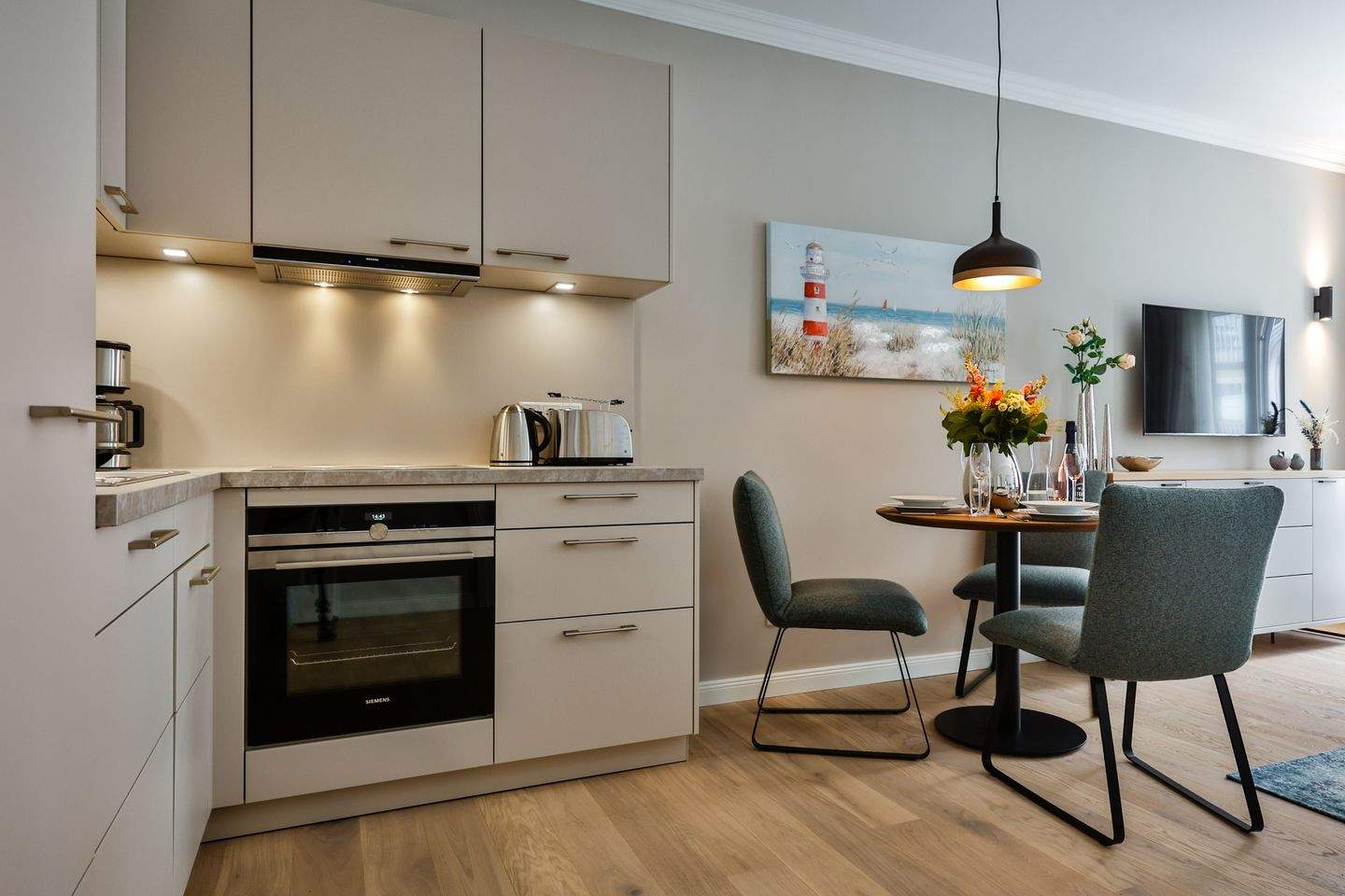 Diese hochwertige Ferienwohnung bietet eine voll ausgestattete Küche mit modernem Komfort, Fußbodenheizung, TV-Flachbildschirm und Musikanlage. Waschtrockner (Kombigerät) vorhanden. Genießen Sie entspannte Stunden auf dem Balkon.