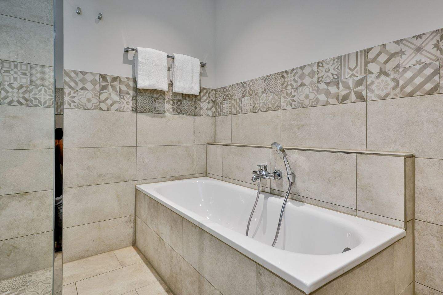 1. Badezimmer (Duschbad), Badewanne, WC und Föhn.