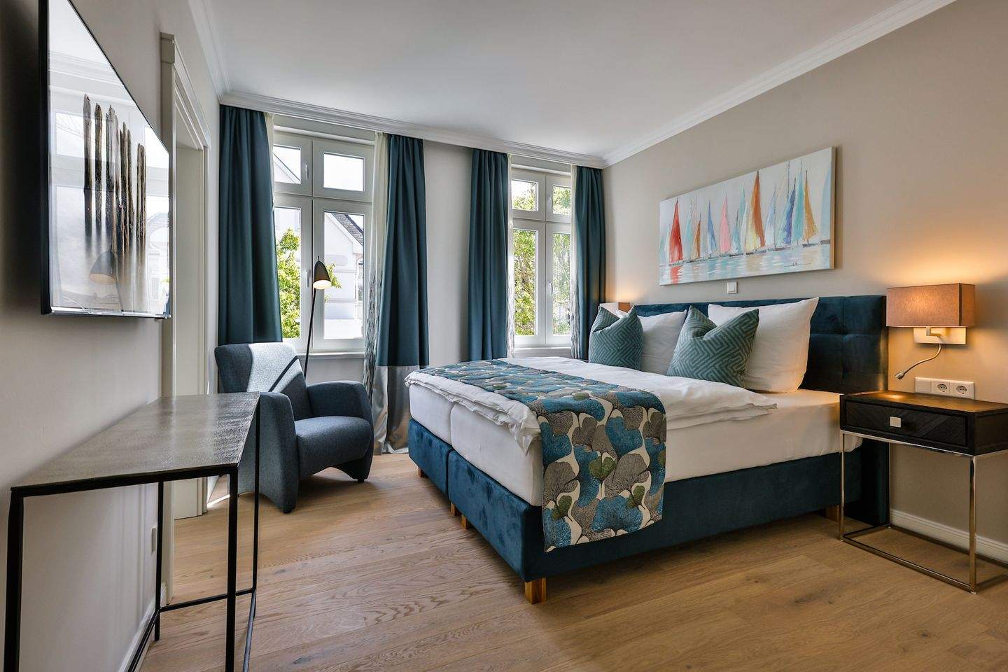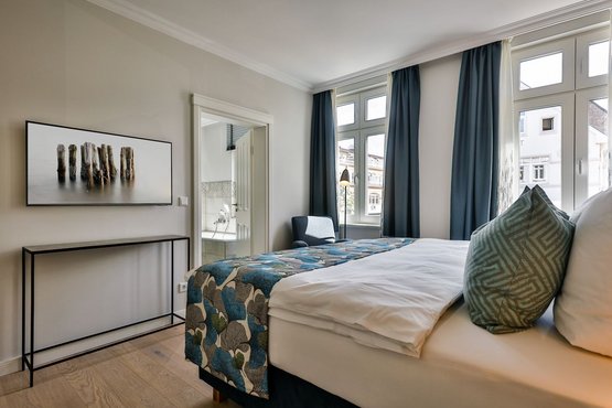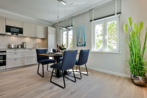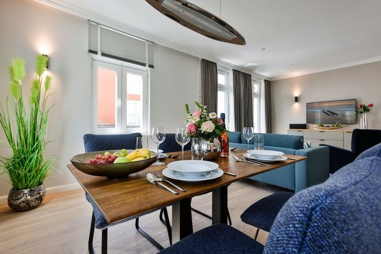 Moderne 3-Zimmer Ferienwohnung im 1. OG im Logierhaus Jonna mit 90 m² für 2-4 Personen in zentraler und trotzdem ruhiger Lage in Westerland, nur ca. 50 m von der Einkaufsmeile Friedrichstraße und ca. 200 m von der Strandpromenade entfernt.
