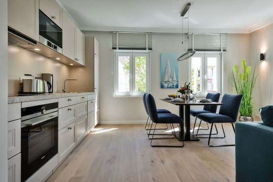 Diese hochwertige Ferienwohnung bietet eine voll ausgestattete Küche mit modernem Komfort, Fußbodenheizung, TV-Flachbildschirm und Musikanlage. Waschtrockner (Kombigerät) vorhanden. Genießen Sie entspannte Stunden auf den schönen Balkonen!