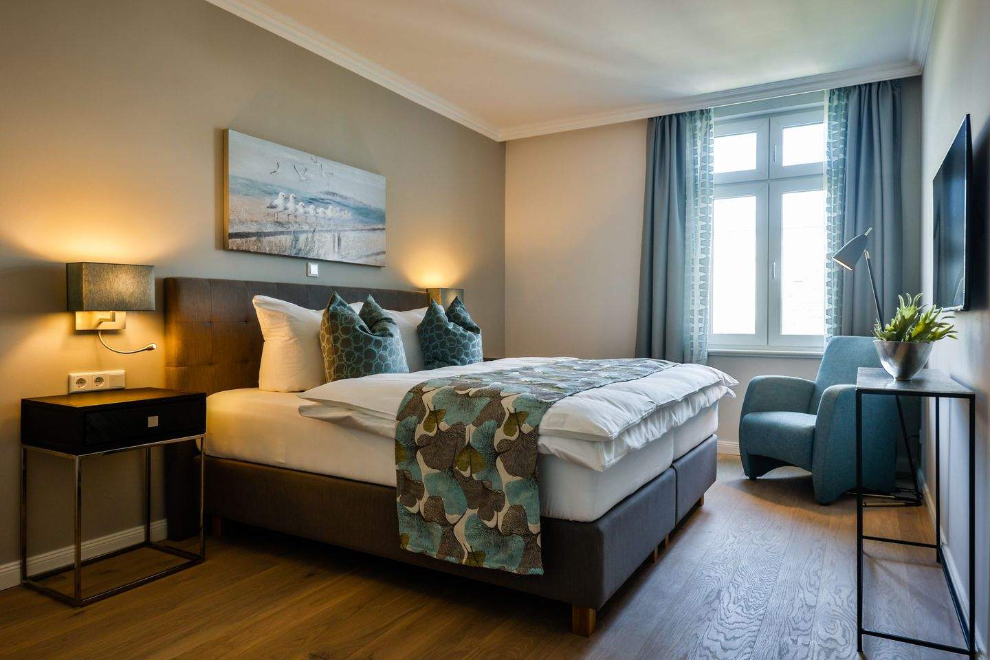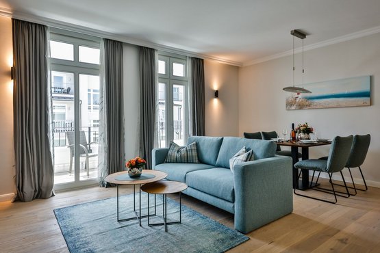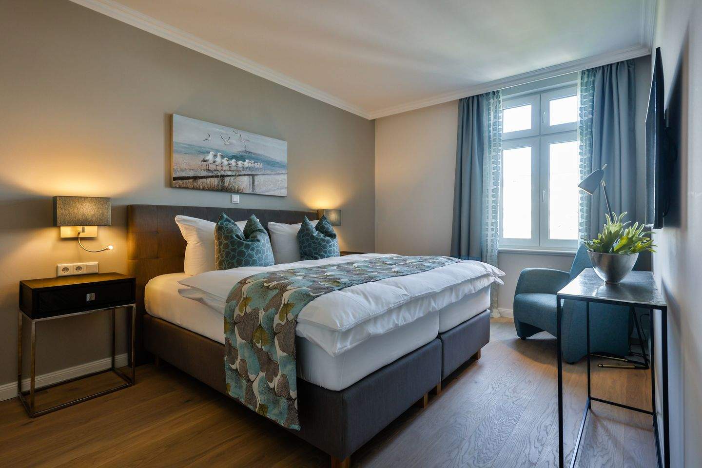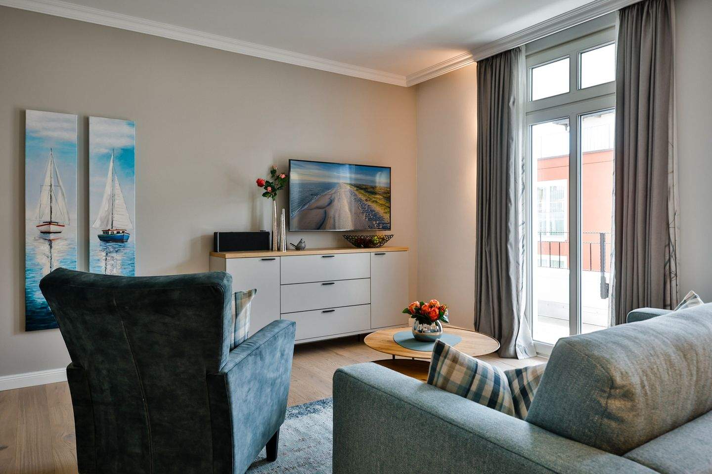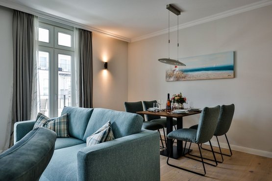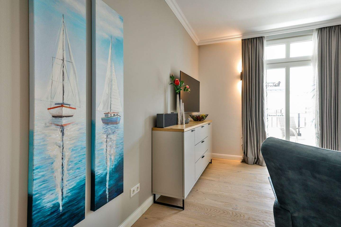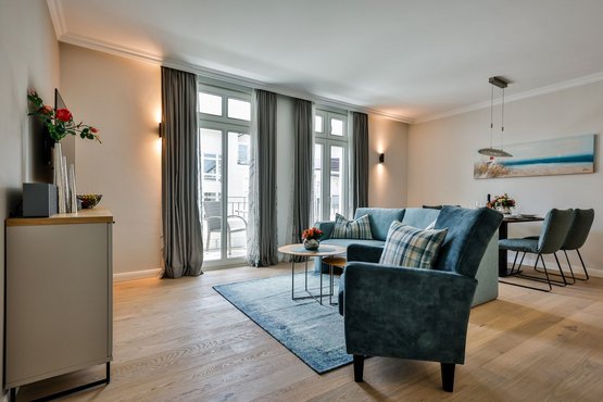 Moderne 2-Zimmer Ferienwohnung im 2. OG im Logierhaus Jonna mit 69 m² für 3 Personen (auf Anfrage 2 Erwachsene und 2 Kinder) in zentraler und trotzdem ruhiger Lage in Westerland, nur ca. 50 m von der Einkaufsmeile Friedrichstraße und ca. 200 m von der Strandpromenade entfernt.