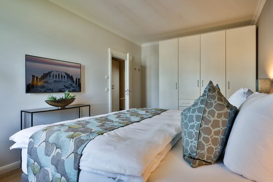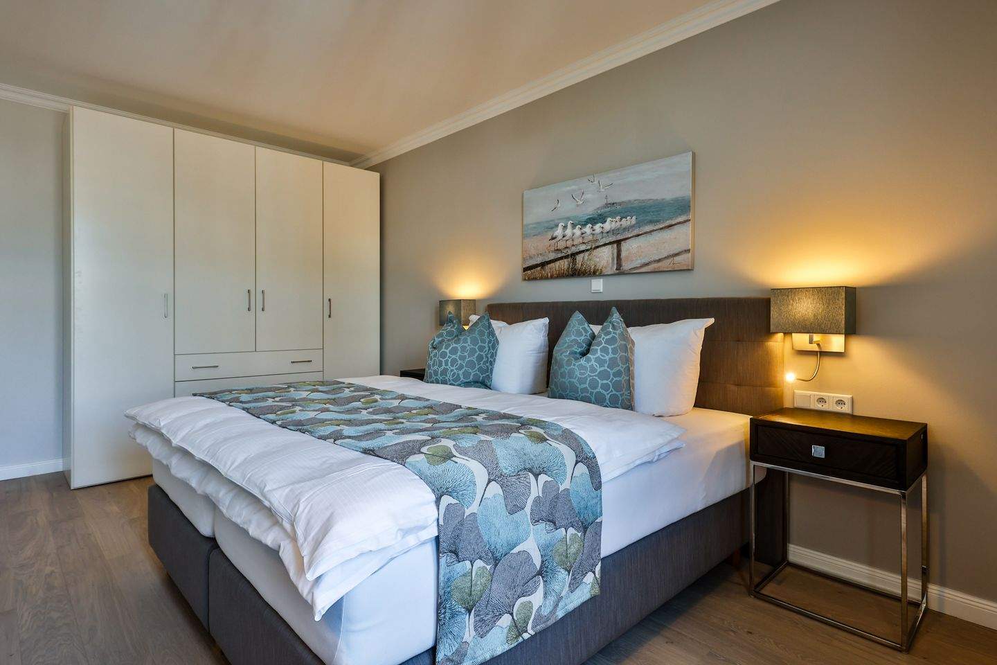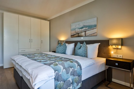 1. Schlafzimmer mit Boxspringbett (180x200cm) und TV.