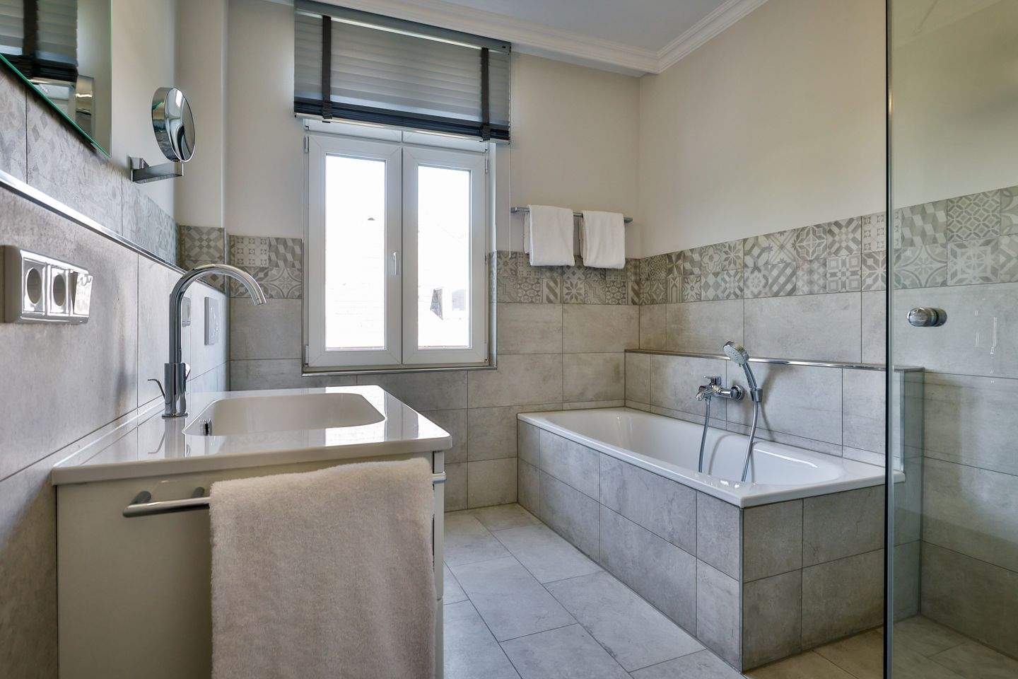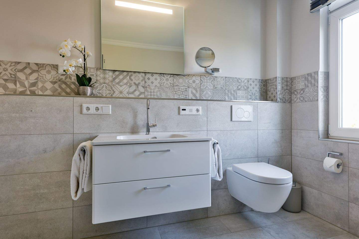 1. Badezimmer (Duschbad), Badewanne, WC und Föhn.