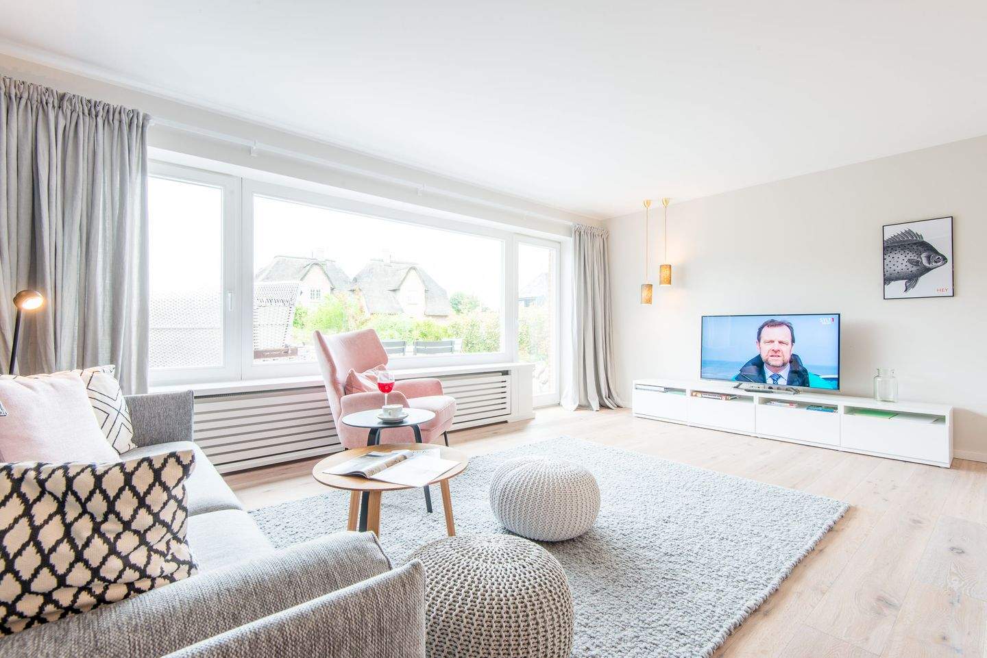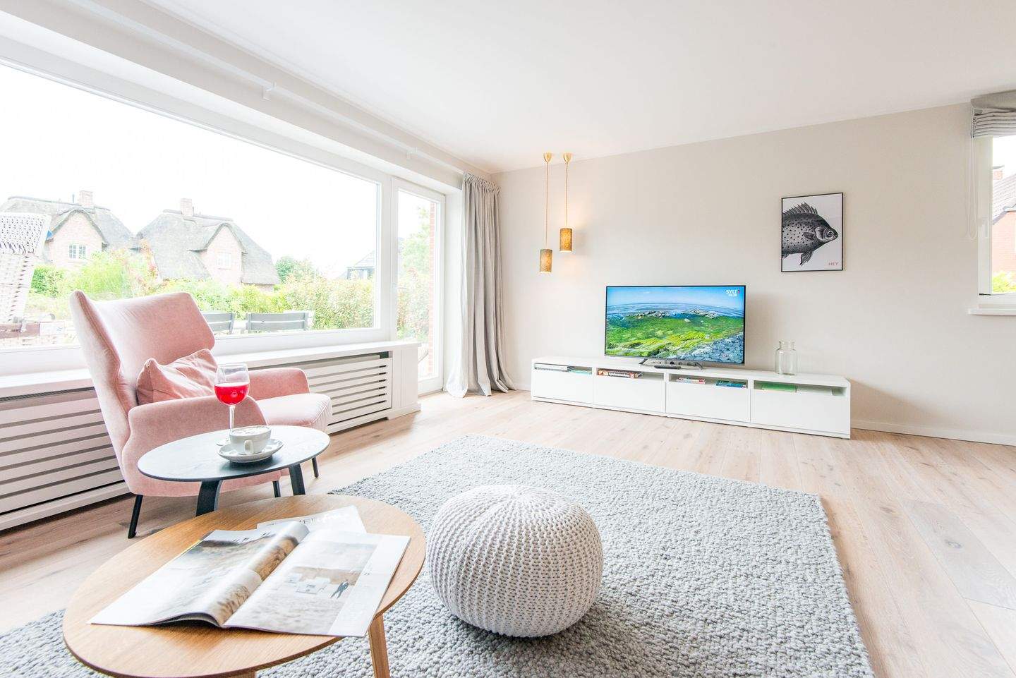 Wohn- und Esszimmer, großer Tisch für 6 Personen, Sofa, TV und mit direktem Zugang zur Terrasse mit Strandkorb und großem Garten.