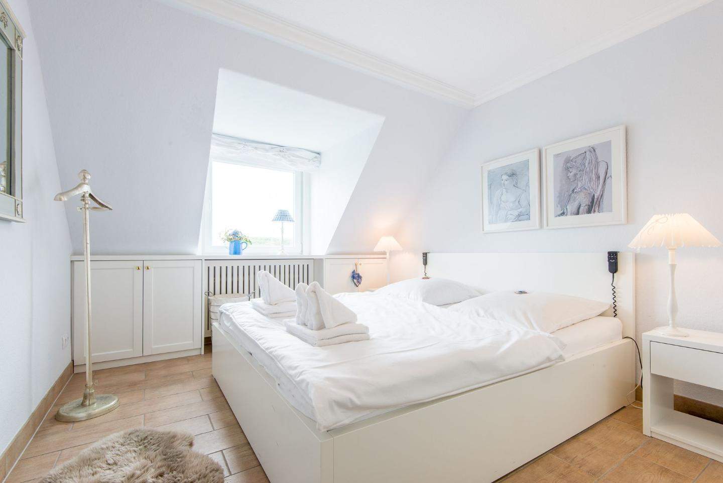 1. Schlafzimmer mit Doppelbett (2x 90x200cm), TV und Kleiderschrank.
