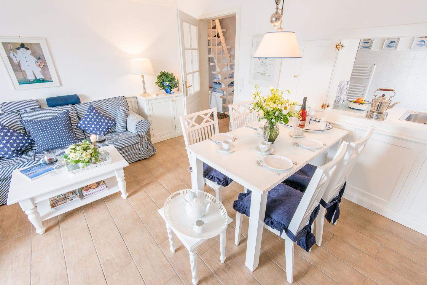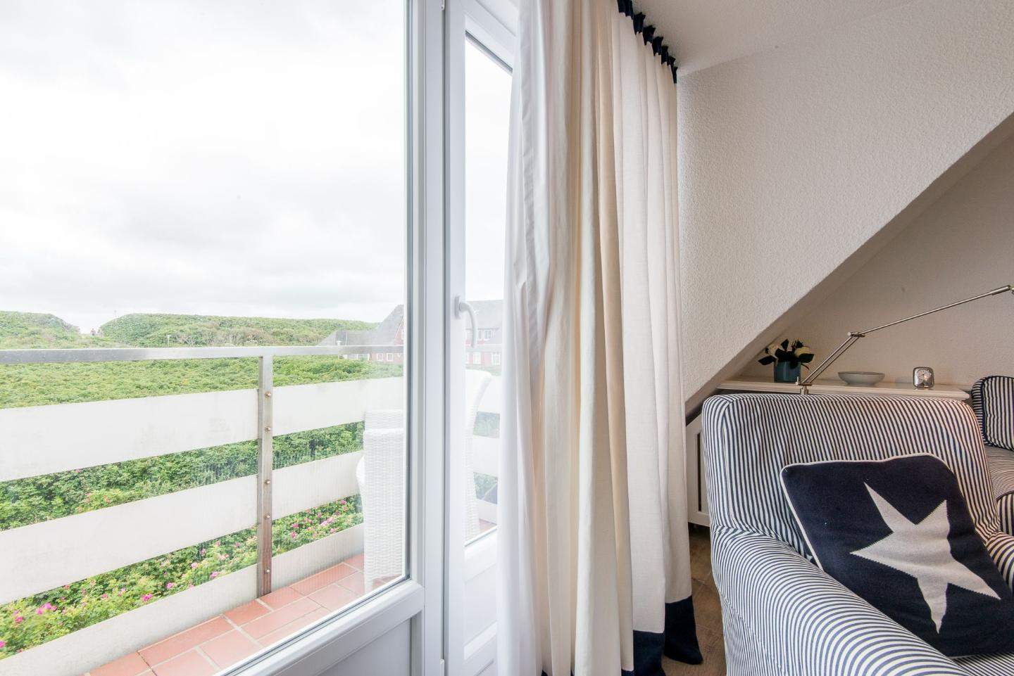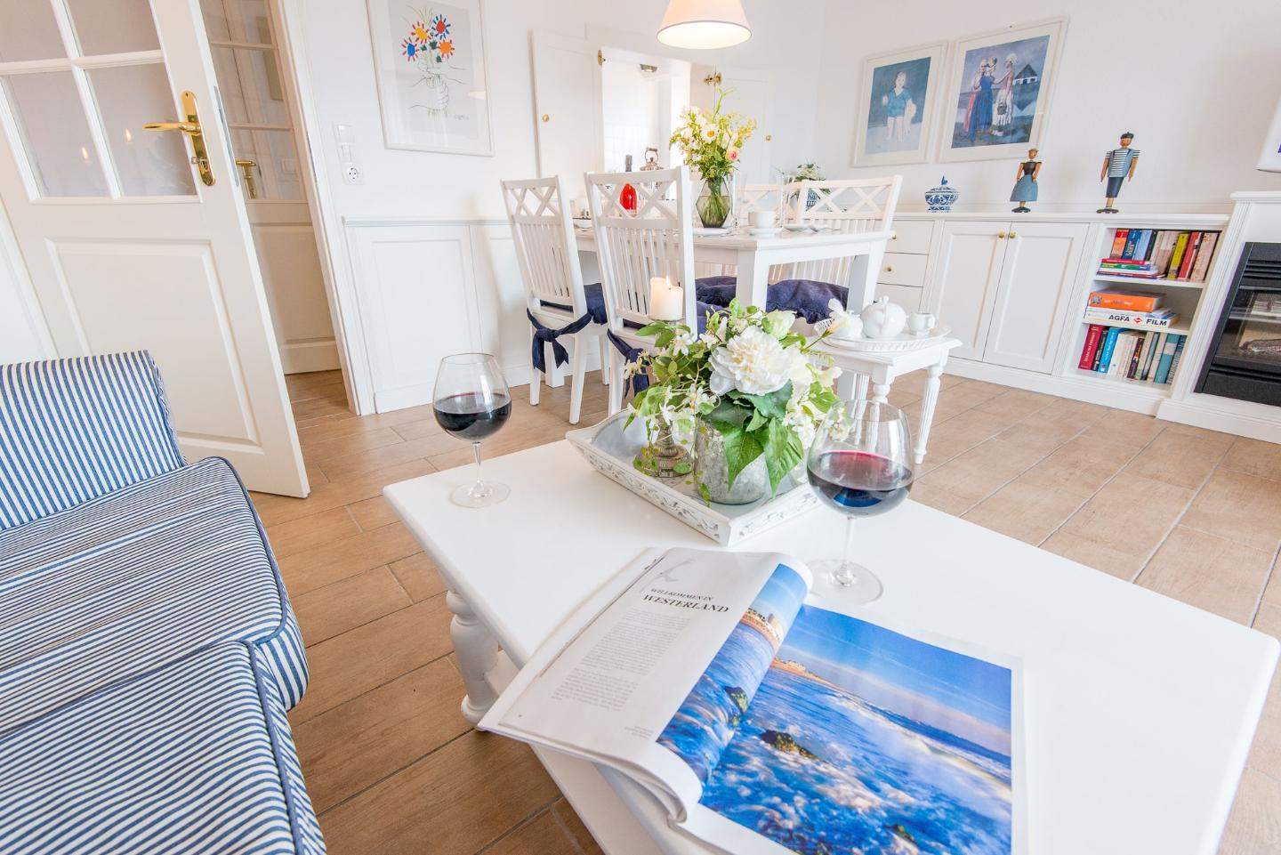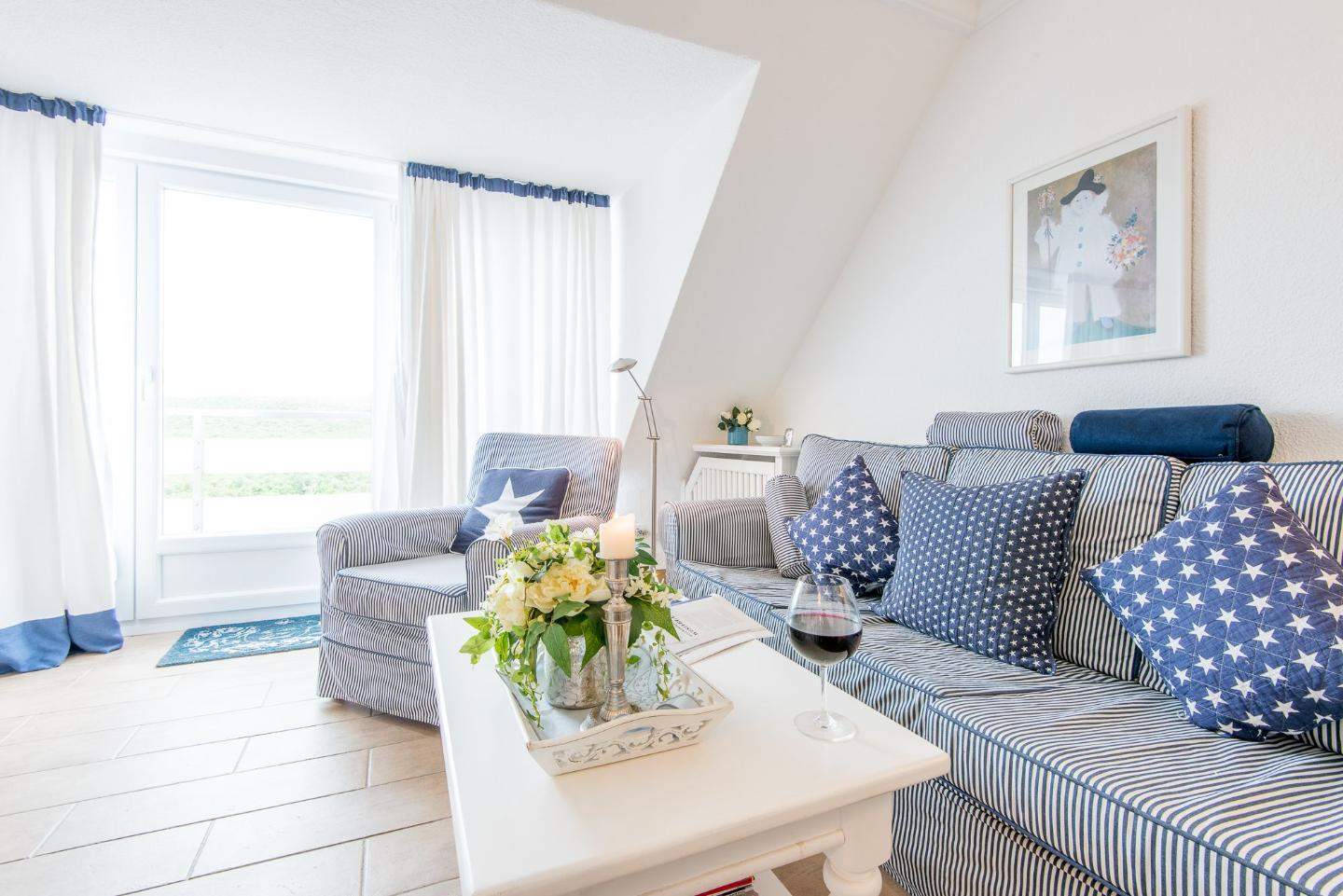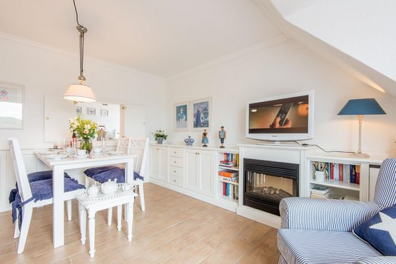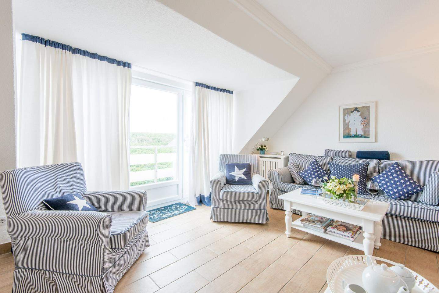 Hell und sonnig ausgerichtet. Sylter Gemütlichkeit in strandnaher Lage in Westerland auf Sylt. Nichtraucherwohnung. Wohnzimmer mit Sofa, Sessel, Esstisch mit 4 Stühlen, TV und direktem Zugang zum Balkon mit herrlichem Ausblick über die Dünen, frische Luft und Meeresrauschen inklusive.