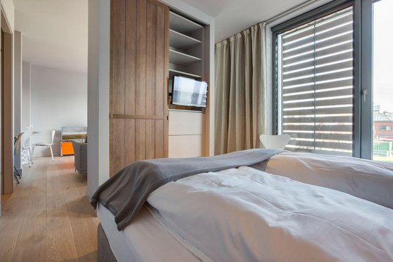Schlafbereich mit Boxspring-Doppelbett (2x 90x200cm), TV und Einbauschrank als Raumteiler.