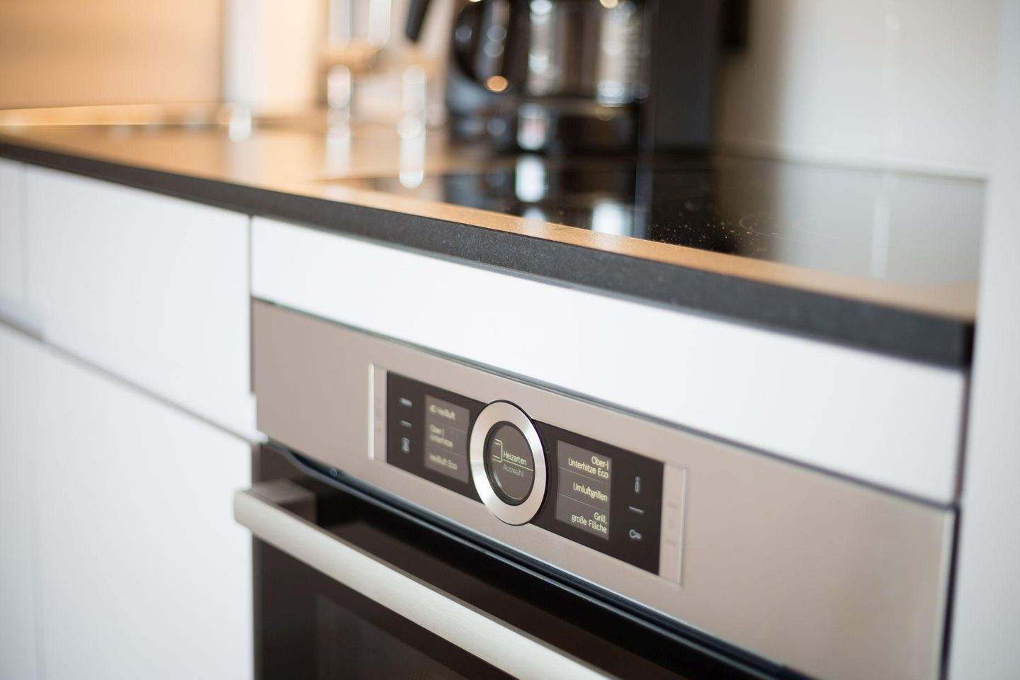 Offene Küche mit Geschirrspüler, Backofen, Cerankochfeld, Filterkaffeemaschine und allem modernen Komfort.