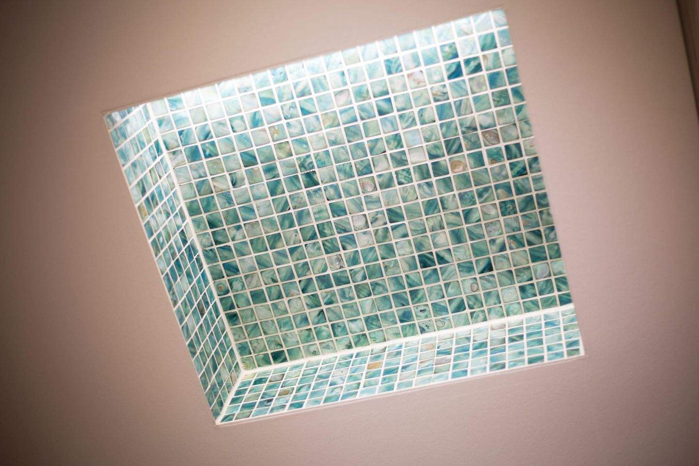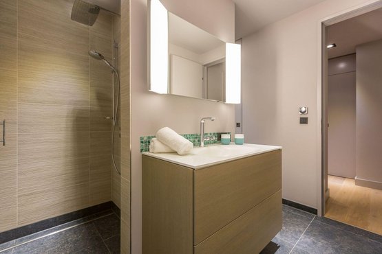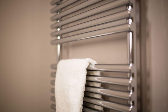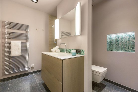 Badezimmer (Duschbad) mit ebenerdiger Dusche, WC, Fön und Handtuchwärmer.