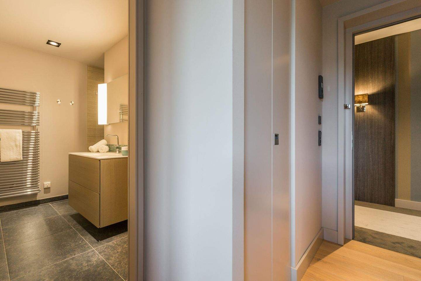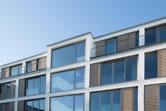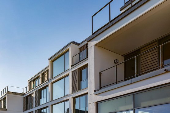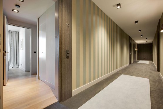 Flur mit Garderobe und Kleiderschrank im Eingangsbereich. Die Wohnung verfügt über bodentiefe Fenster mit halbhohen Glaselementen. Ohne Balkon, dafür mit großem Schiebe-Element.