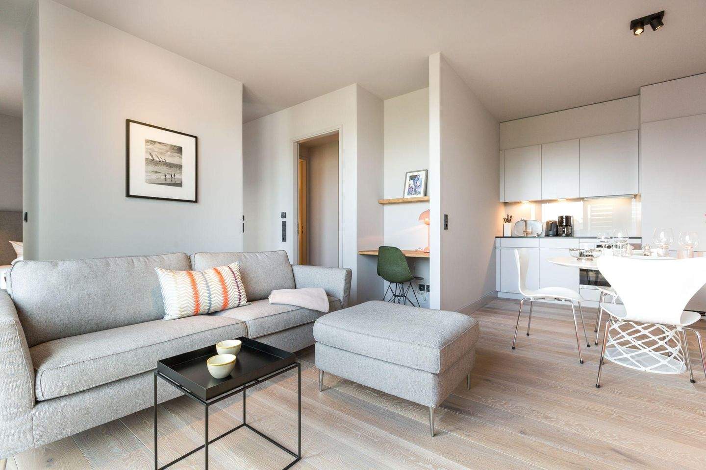 Luxuriöse Großzügigkeit durch perfekt platzierten Raumteiler. Zentrale und strandnahe Lage in Westerland auf Sylt. Restaurant-Vielfalt in direkter Nähe. Nichtraucherwohnung. Haustiere nicht gestattet. Modernes Wohn- und Schlafzimmer mit 3er-Sofa und Fußteil, Sessel, runder Esstisch für 4 Personen und TV. Kleiner Schreibtisch mit original Eames-Chair.