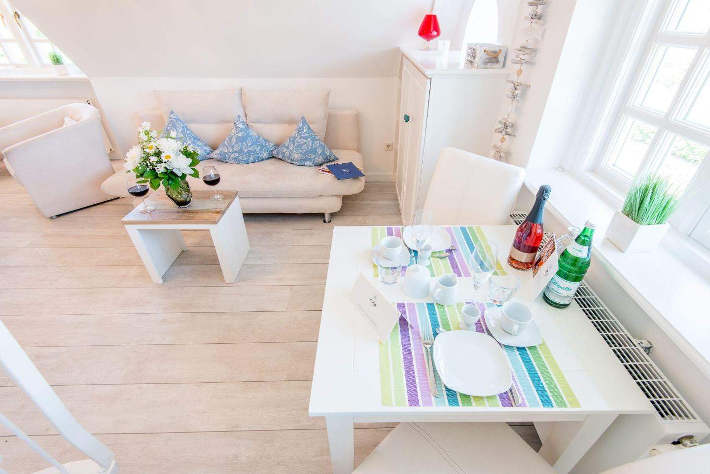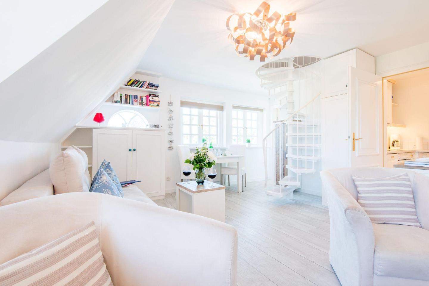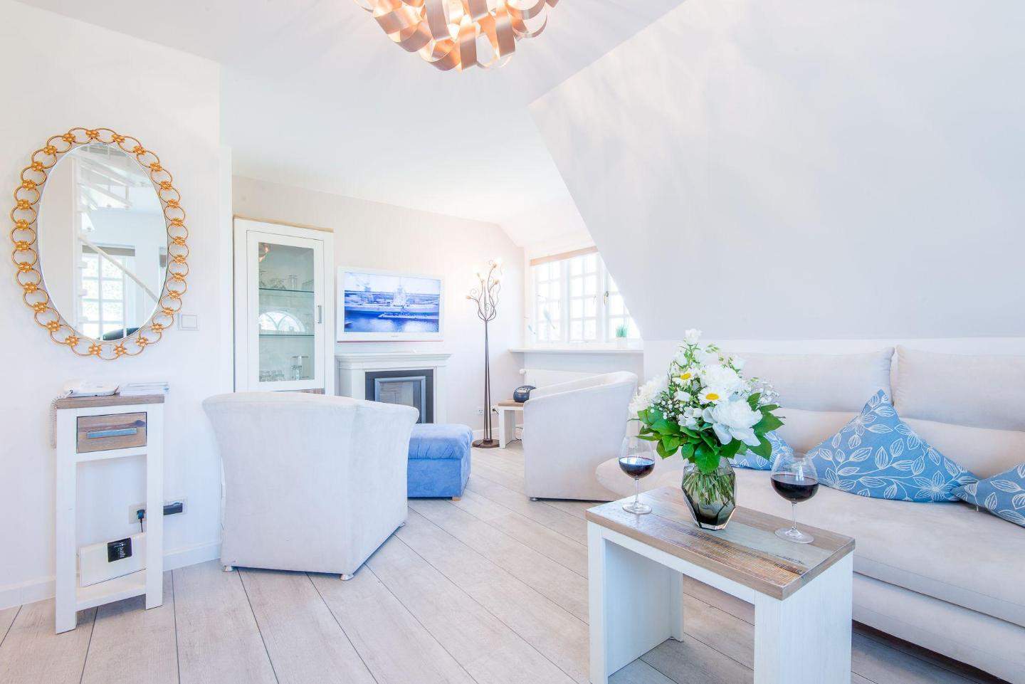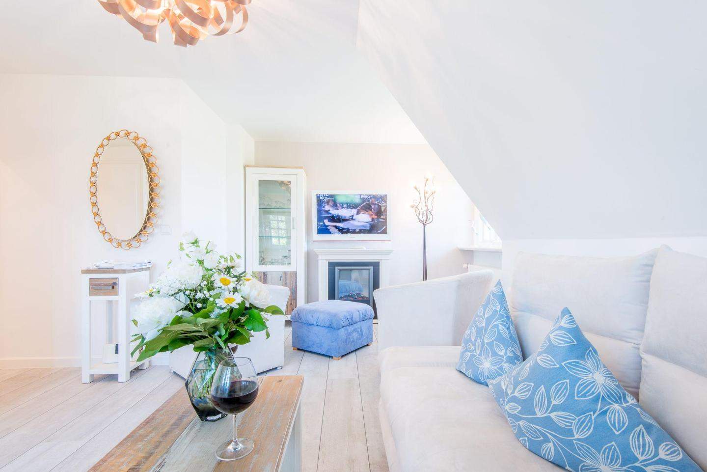 Die ideale Lage in Kampen auf Sylt: nah zur legendären 'Whiskymeile', zum Wattenmeer sowie zum Strandabschnitt Buhne 16. Rauchen nicht gestattet. Wohnzimmer mit Sofa und Sitzecke, großem TV, Elektrokamin und Esstisch für 2 Personen.