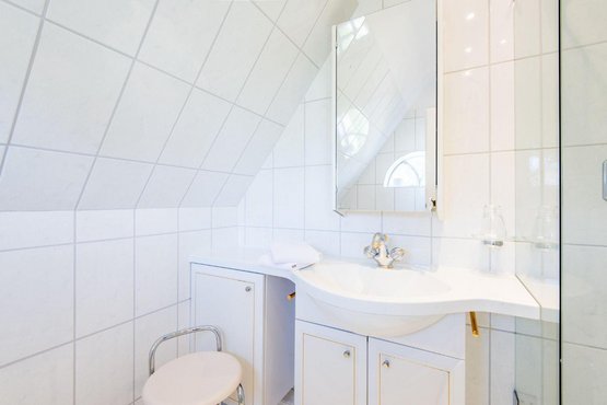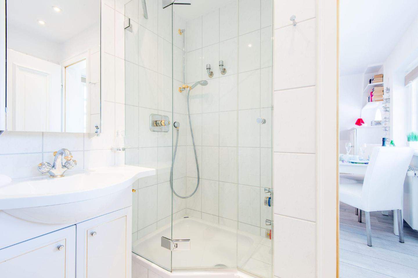 Badezimmer (Duschbad) mit Dusche, WC, Föhn und Tageslicht.