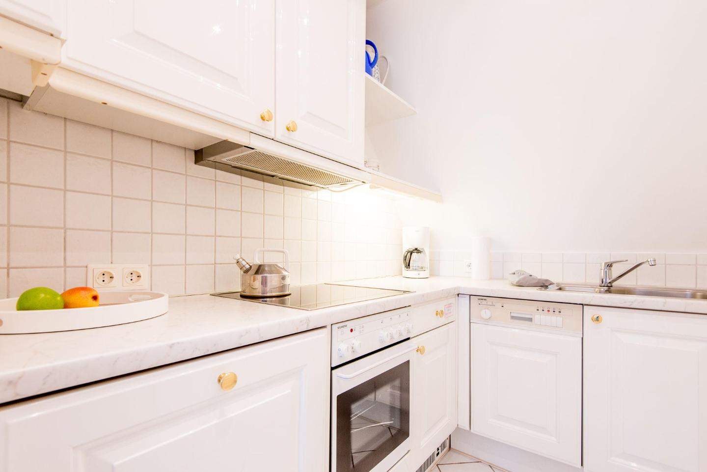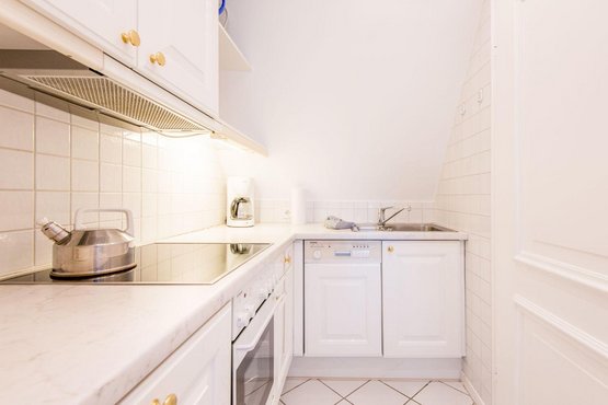 Separate Küchenzeile im Eingangsbereich mit 4-flammigem Herd, Geschirrspüler und dem üblichen Komfort.