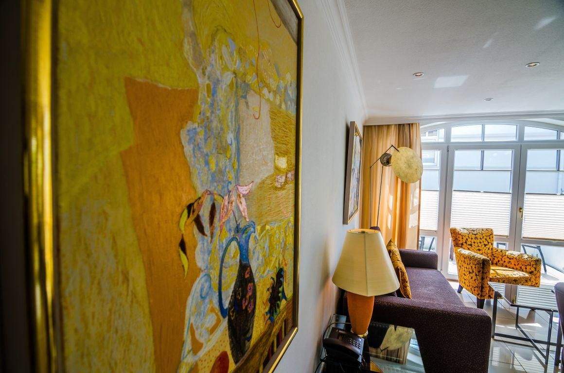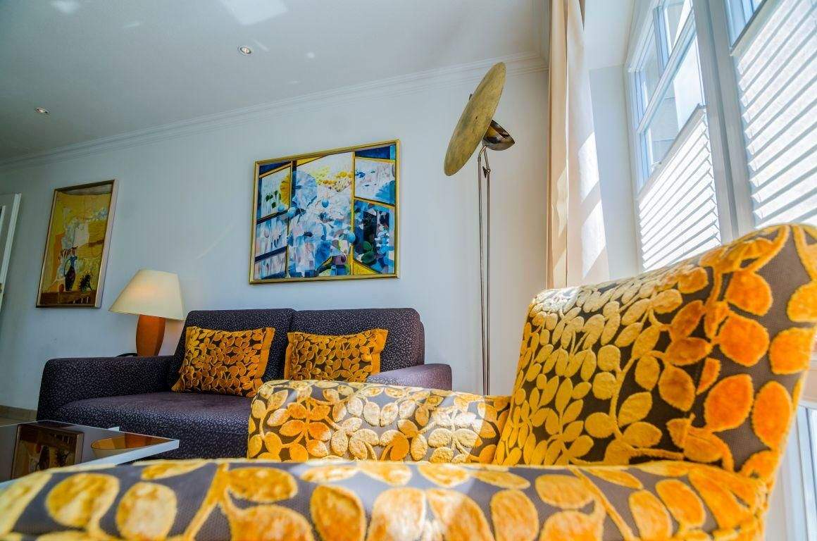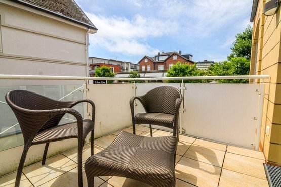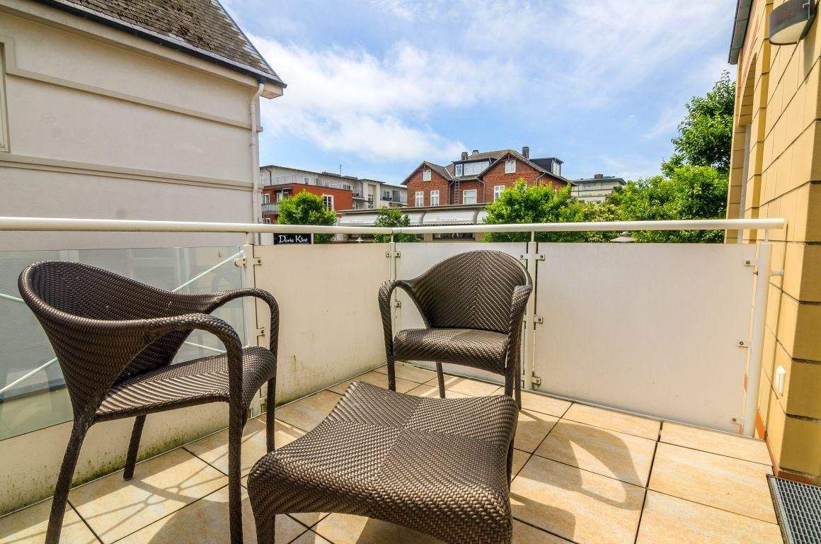 Ausgesprochen beliebt aufgrund des luxuriösen Wellnessbereichs mit Sauna, Dampf- und Hallenbad sowie der exquisiten Lage in Westerland auf Sylt: mittendrin in der Innenstadt mit all ihren Annehmlichkeiten, aber dennoch schön ruhig. Und zum Strand sind es nur wenige Minuten. Hunde auf Anfrage. Die perfekte (Nichtraucher-) Ferienwohnung für den perfekten Urlaub. Wohnzimmer mit ausziehbarem (Schlaf-) Sofa (140x200cm), 2 Sesseln, Esstisch mit 4 Stühlen, TV und direktem Zugang zum möblierten Balkon nach Süden und zur Loggia nach Westen (Terrassenfläche insgesamt ca. 18 m²).