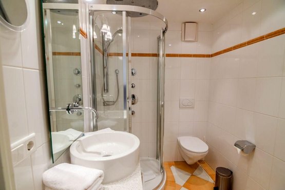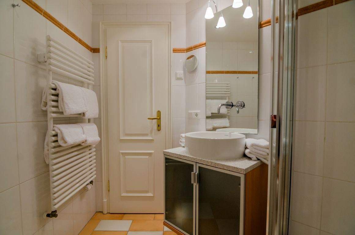 Badezimmer (Duschbad) mit Dusche, Handtuchwärmer, WC und Föhn.