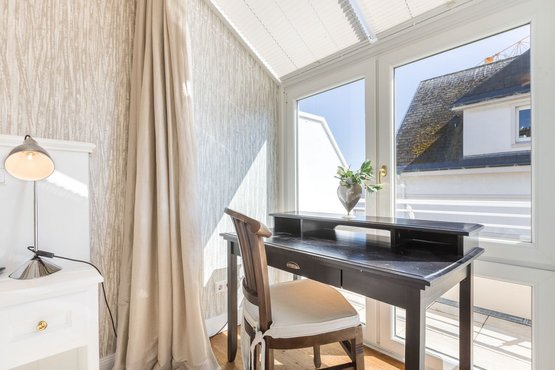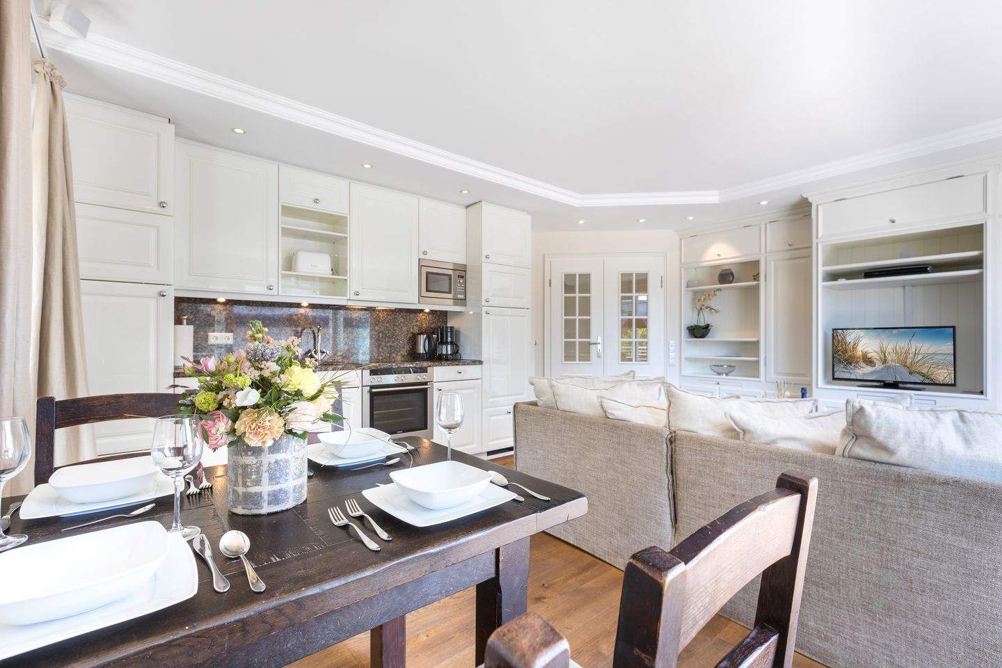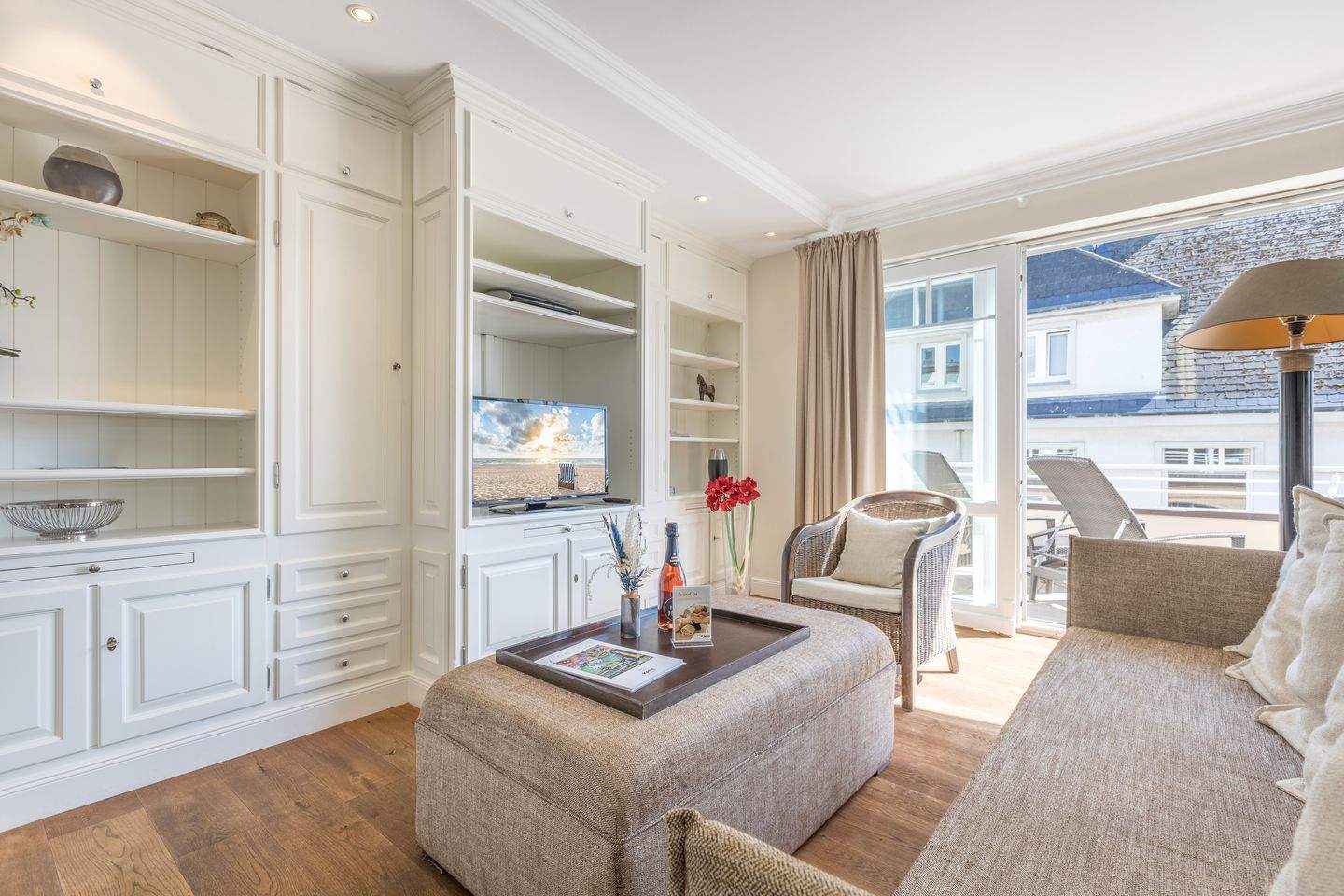 Ausgesprochen beliebt aufgrund des luxuriösen Wellnessbereichs mit Sauna, Dampf- und Hallenbad sowie der exquisiten Lage in Westerland auf Sylt: mittendrin in der Innenstadt mit all ihren Annehmlichkeiten, aber dennoch schön ruhig. Und zum Strand sind es nur wenige Minuten. Die perfekte (Nichtraucher-) Ferienwohnung für den perfekten Urlaub. Helles Wohnzimmer mit ausziehbarem (Schlaf-) Sofa (160x200cm), Sessel, Esstisch mit 4 Stühlen, TV und direktem Zugang zur möblierten, teilweise überdachten Terrasse nach Süden.