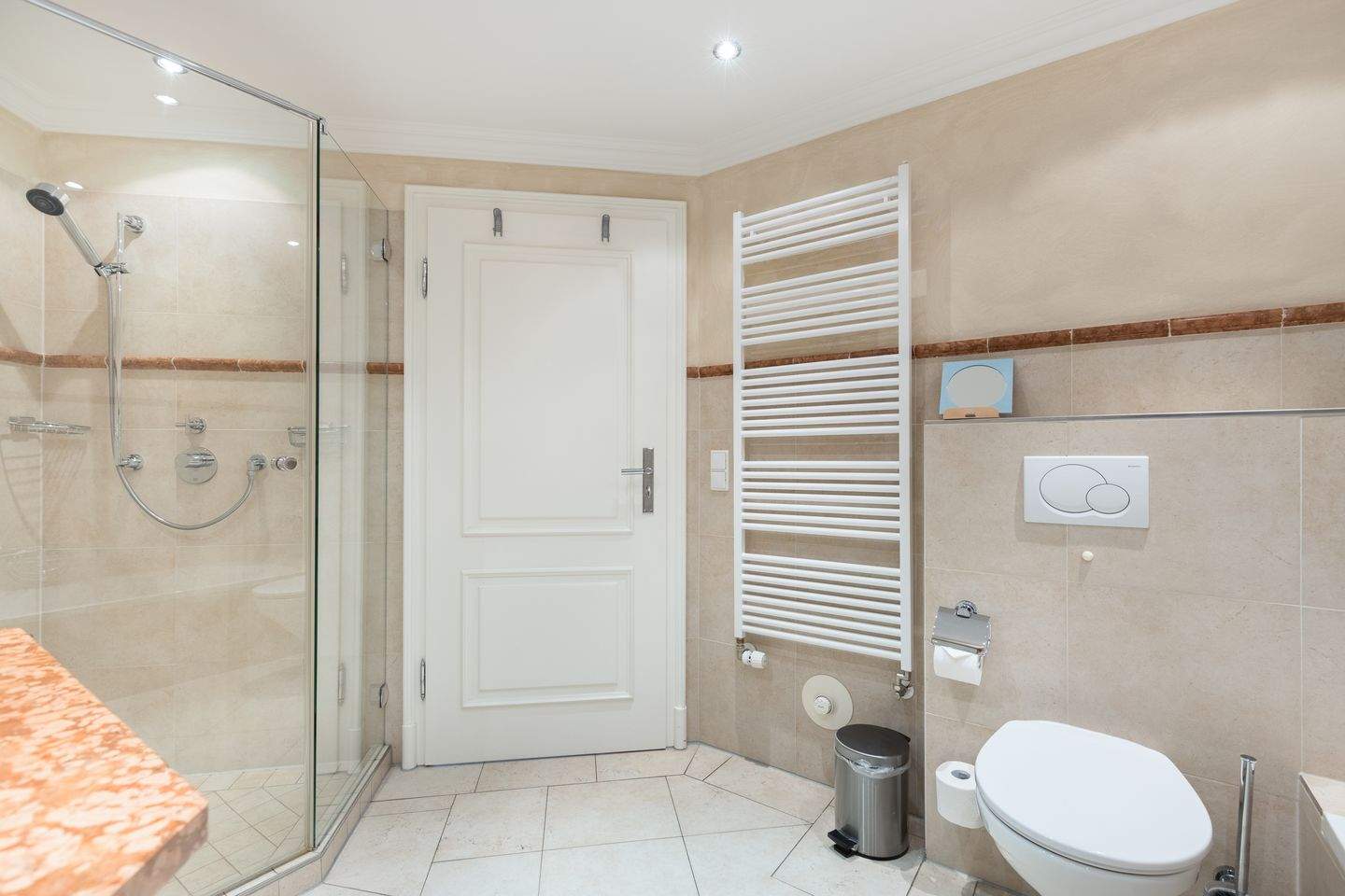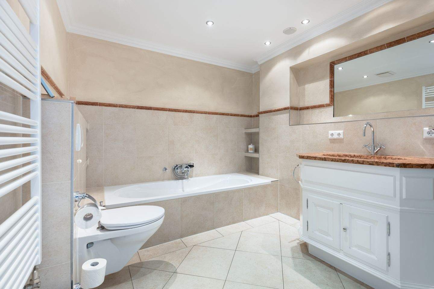 Badezimmer (Vollbad) mit Badewanne, Dusche, Handtuchwärmer, WC und Föhn.