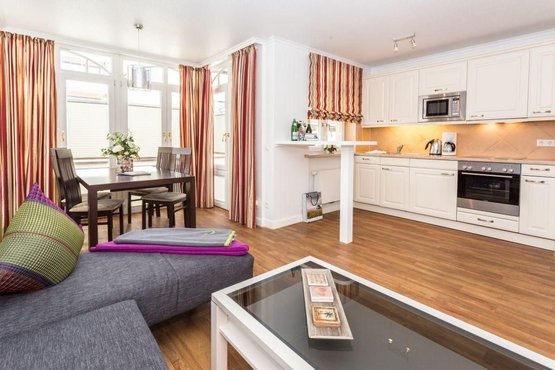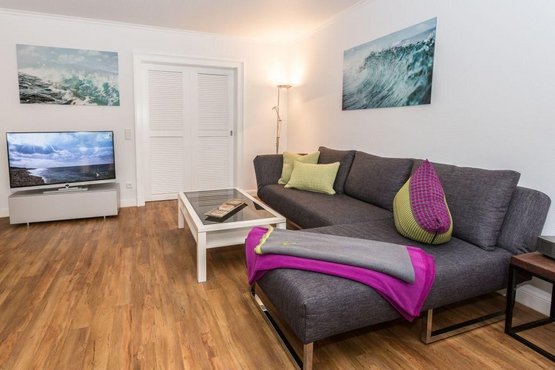 Ausgesprochen beliebt aufgrund des luxuriösen Wellnessbereich mit Sauna, Dampf- und Hallenbad sowie der exquisiten Lage in Westerland auf Sylt: mittendrin in der Innenstadt mit all ihren Annehmlichkeiten, aber dennoch schön ruhig. Und zum Strand sind es nur wenige Minuten. Hunde willkommen. Die perfekte (Nichtraucher-) Ferienwohnung für den perfekten Urlaub. Wohnzimmer mit (Schlaf-) Sofa (75x210cm), Esstisch mit 4 Stühlen und TV.