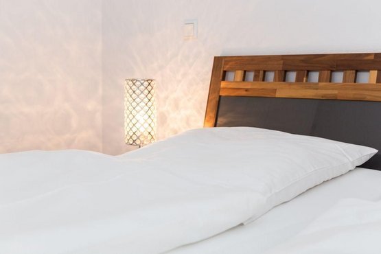 Halboffenes Schlafzimmer mit Doppelbett (2x 90x200cm) und Kleiderschrank.