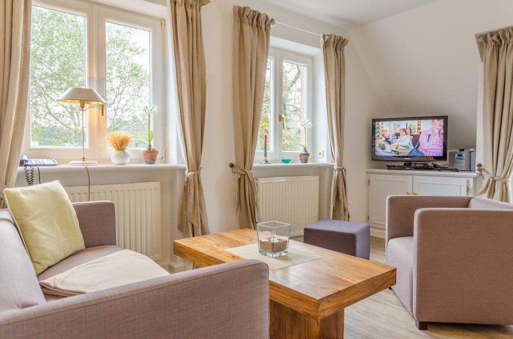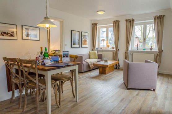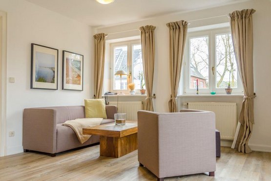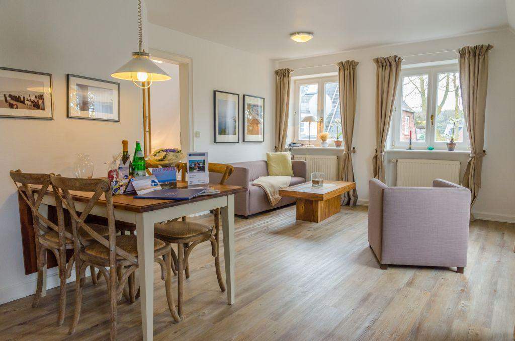 Ruhige Lage in Westerland auf Sylt. Mit Balkon nach Westen. Nichtraucherwohnung. Wohnzimmer mit Sofa für 2 Personen, 2 Sesseln, Esstisch mit 4 Stühlen und TV. Direkter Zugang zum möblierten Balkon nach Westen.