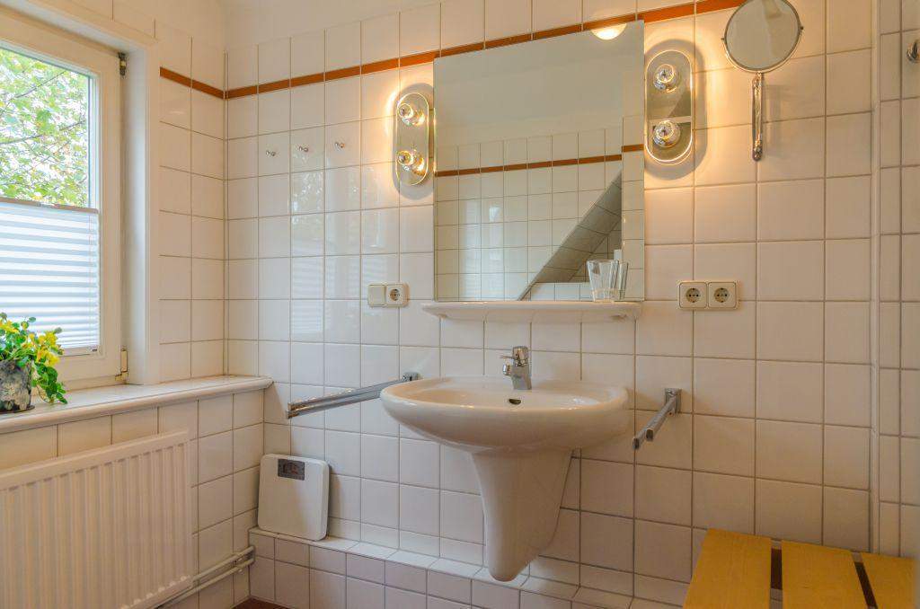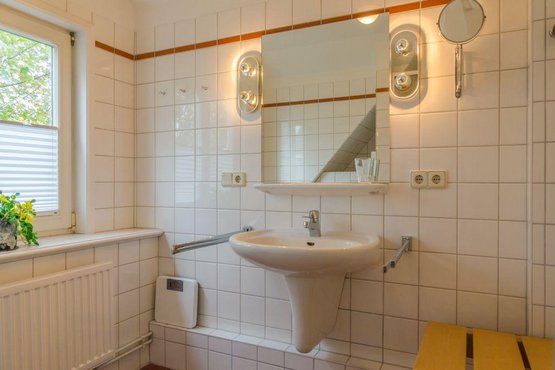 Badezimmer (Duschbad) mit Dusche, WC, Tageslicht und Föhn.