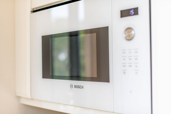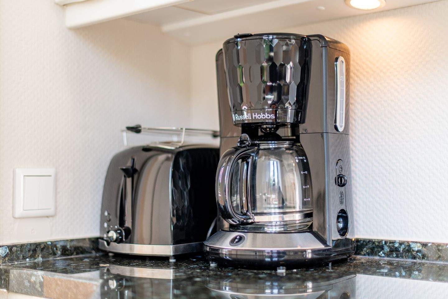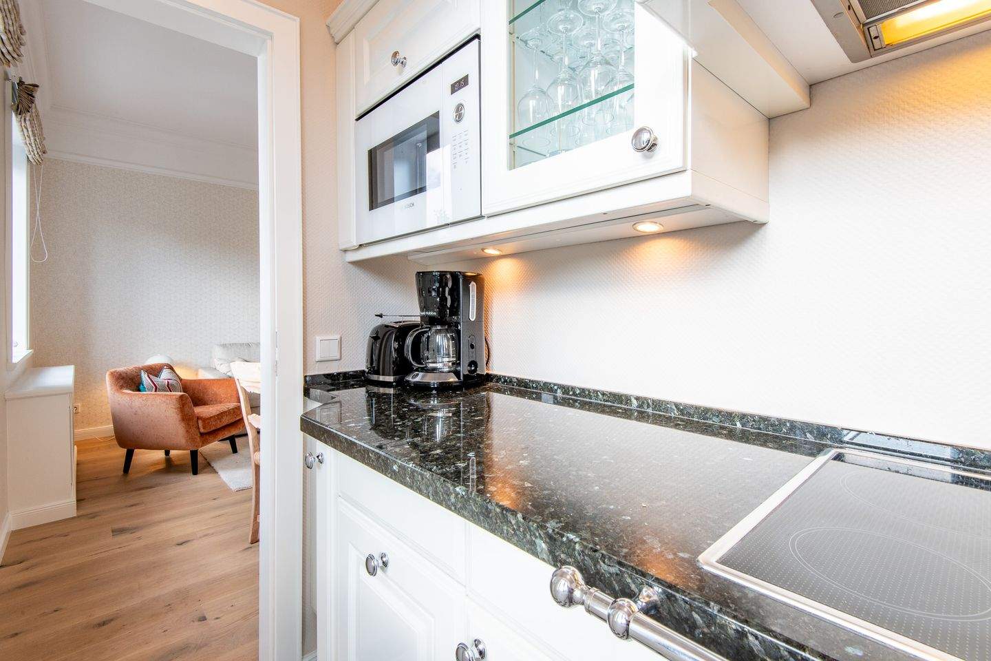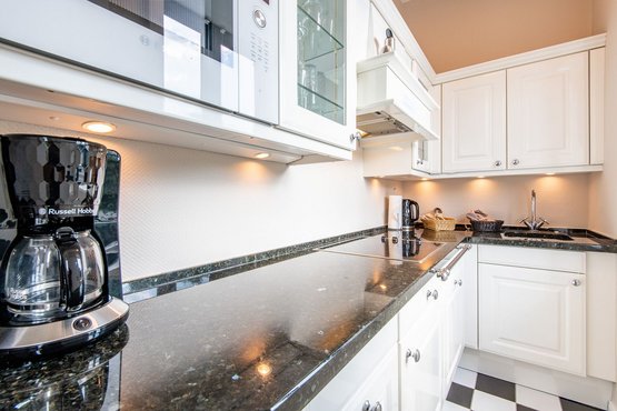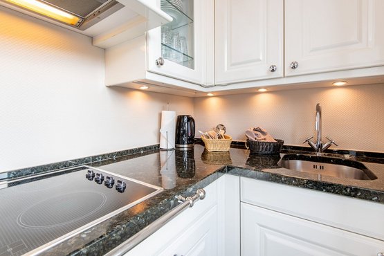 Die separate moderne Hochglanzküche ist mit einer Granitarbeitsplatte, einem Cerankochfeld, einem Geschirrspüler, einer Filterkaffeemaschine und allen Annehmlichkeiten ausgestattet, die Sie für die Zubereitung Ihrer Lieblingsspeisen benötigen.