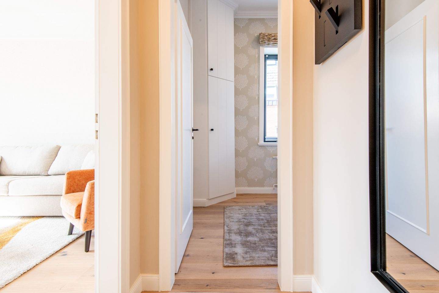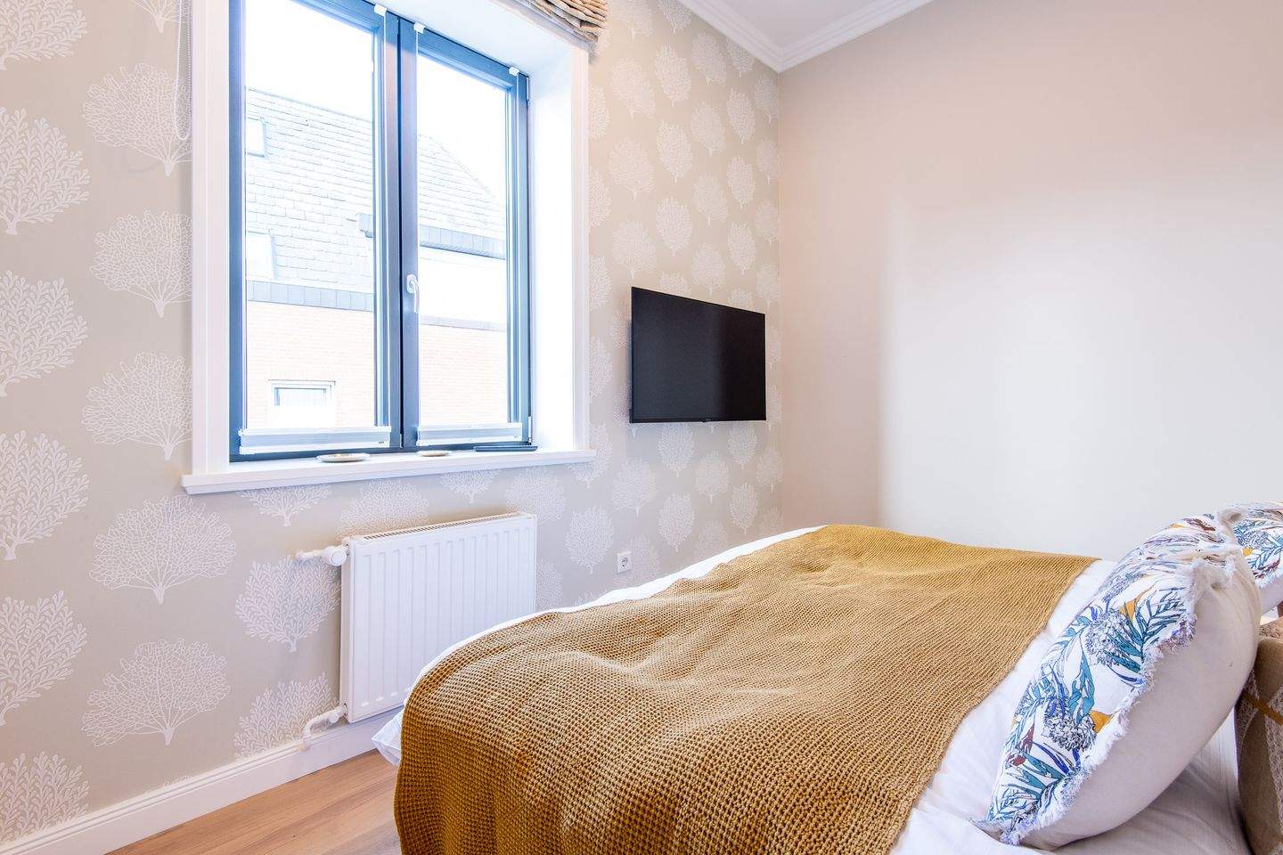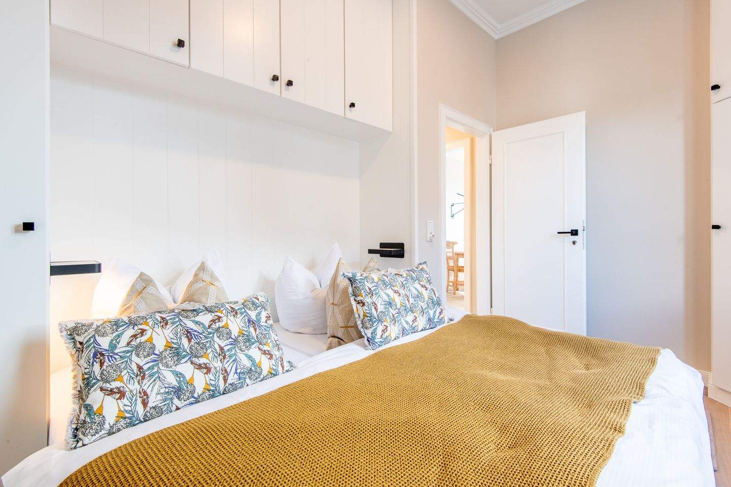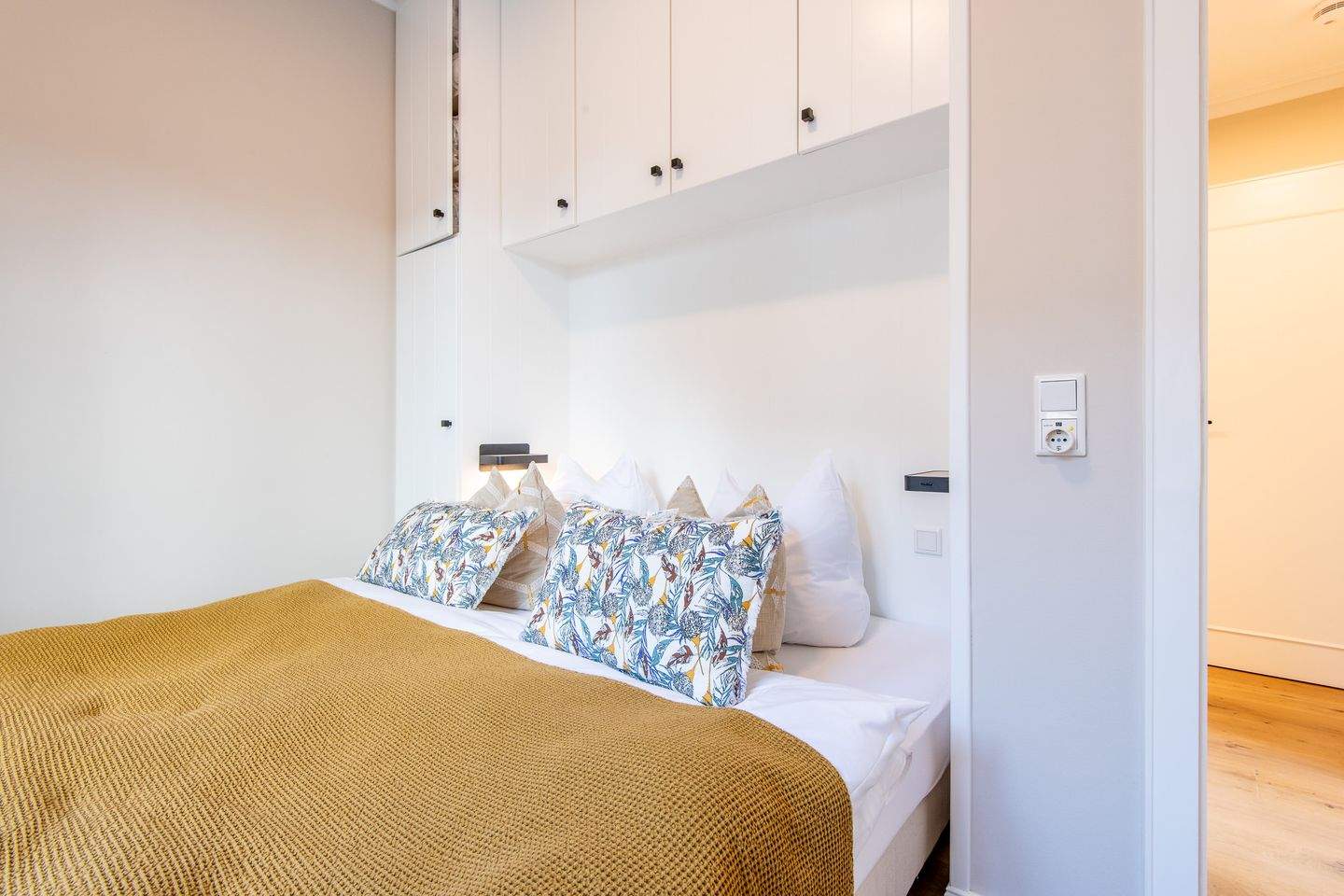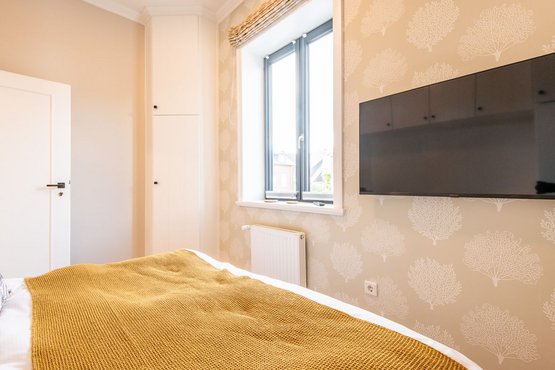 1. Schlafzimmer mit bequemen Boxspringbett (180x200 cm) sowie ein geräumiger Kleiderschrank, der ausreichend Platz für Ihre Kleidung bietet. Das