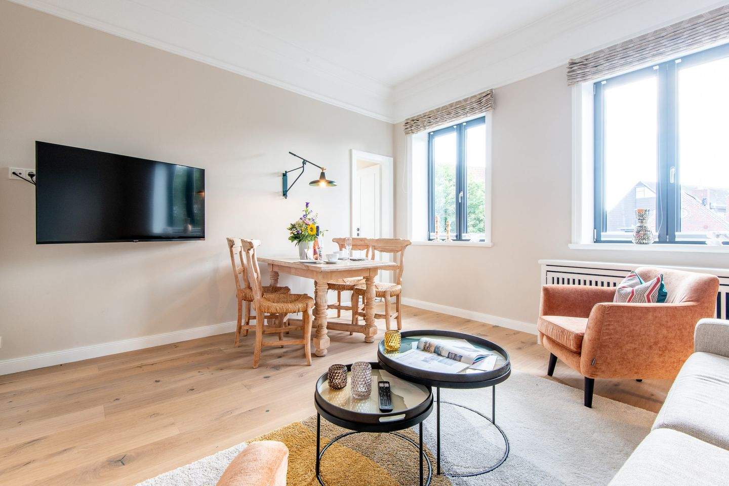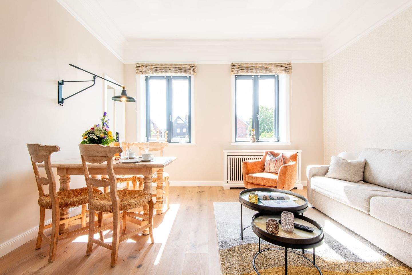 Die Nichtraucherwohnung ist sorgfältig gestaltet, um Ihnen einen gemütlichen Aufenthalt zu bieten. Das Wohnzimmer verfügt über ein komfortables Schlafsofa und eine Essecke, wo Sie Ihre Mahlzeiten genießen können.