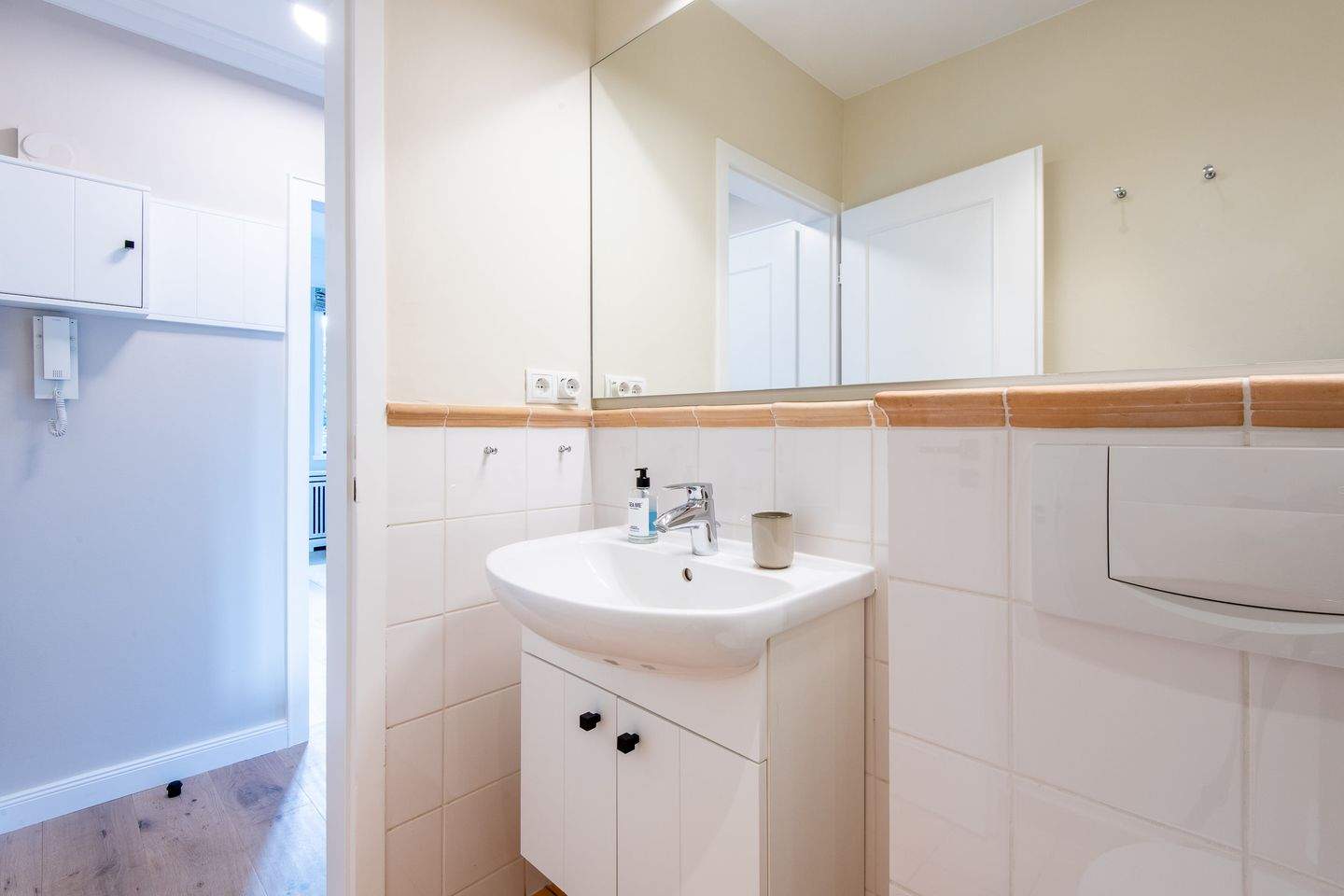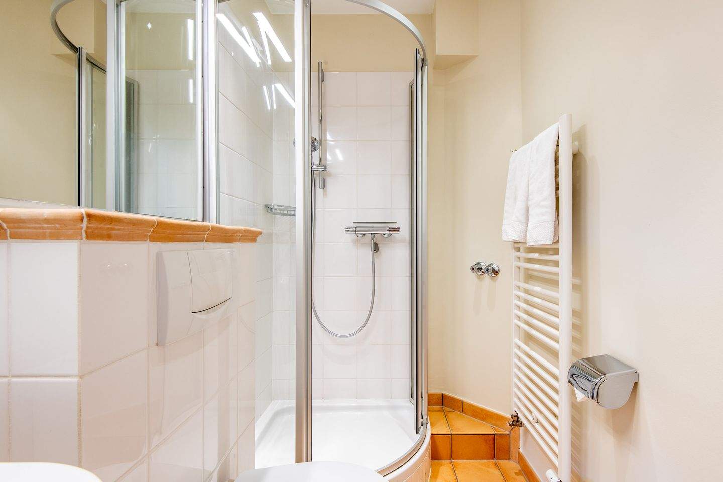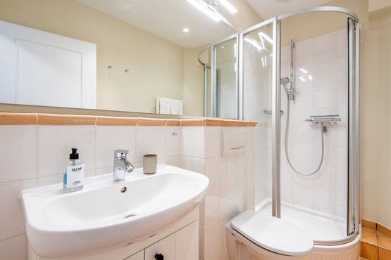 1. Badezimmer verfügt über eine Dusche, ein WC, einen Föhn und einen Handtuchwärmer, damit Sie sich nach einem Tag am Strand erfrischen können.