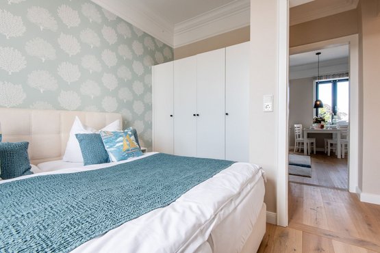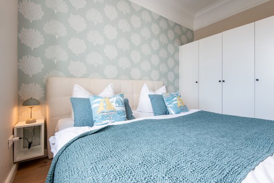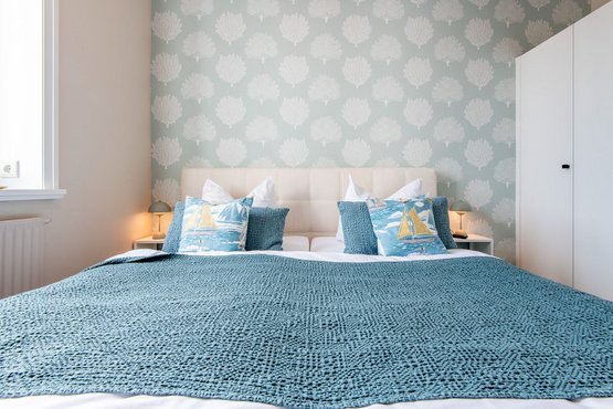 1. Schlafzimmer mit bequemen Boxspringbett (180x200 cm) sowie ein geräumiger Kleiderschrank, der ausreichend Platz für Ihre Kleidung bietet. Das
