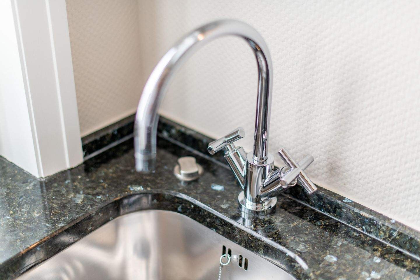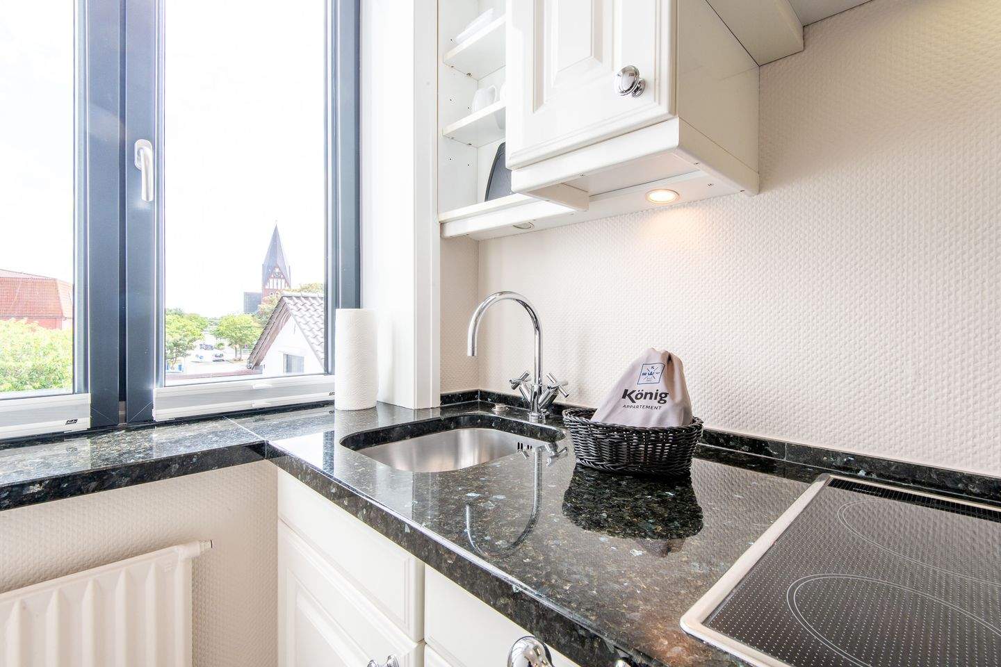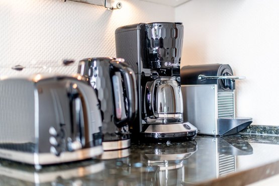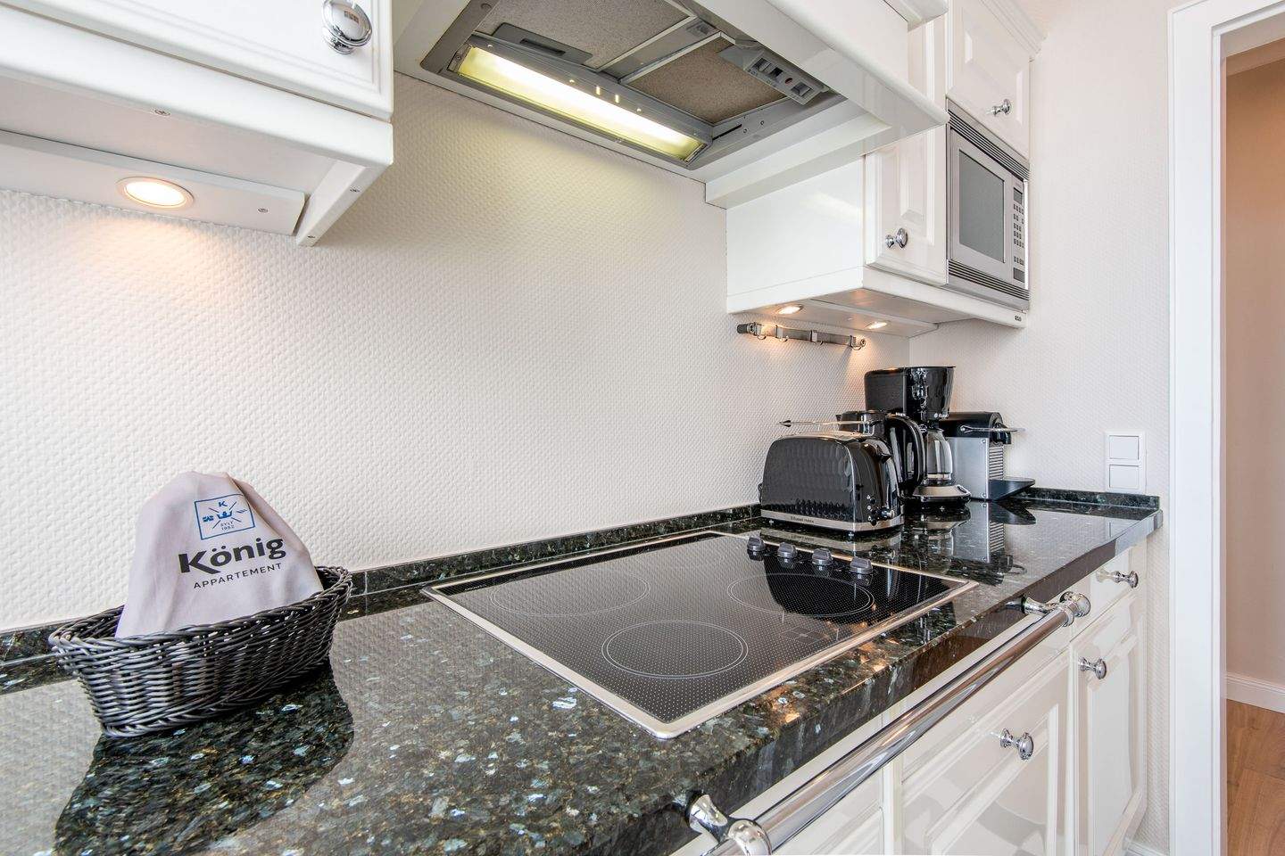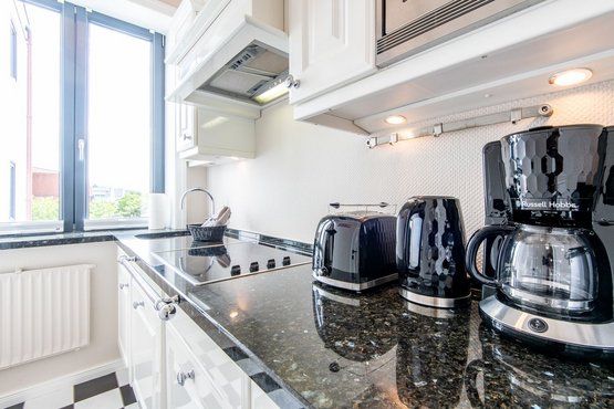 Die separate moderne Hochglanzküche ist mit einer Granitarbeitsplatte, einem Cerankochfeld, einem Geschirrspüler, einer Filterkaffeemaschine und allen Annehmlichkeiten ausgestattet, die Sie für die Zubereitung Ihrer Lieblingsspeisen benötigen.