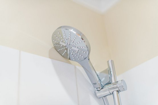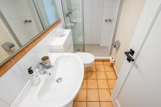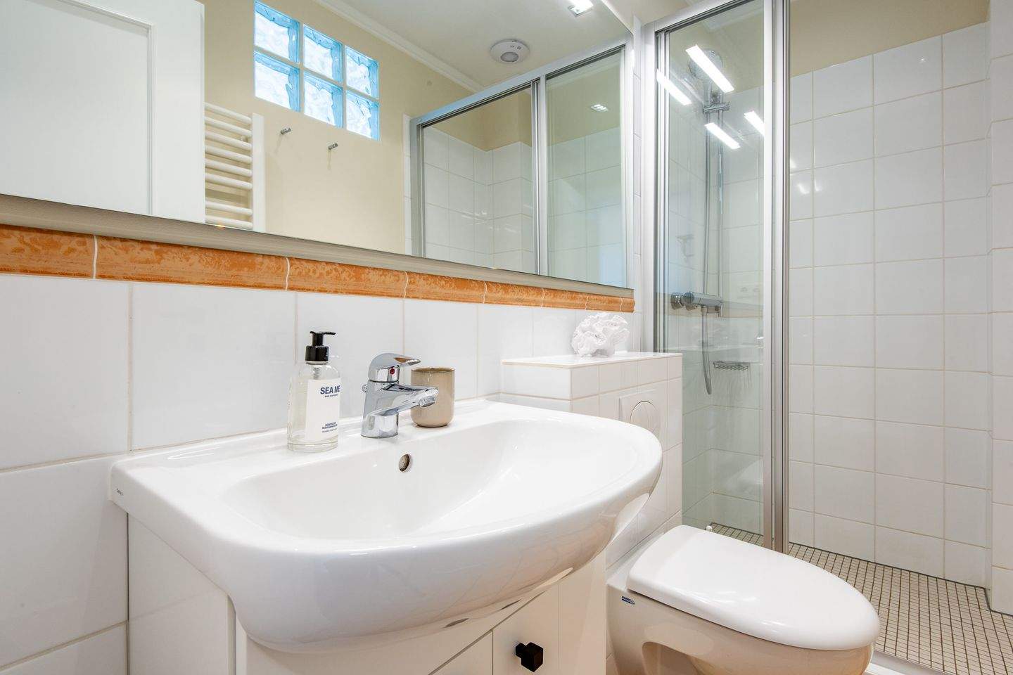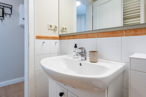 1. Badezimmer verfügt über eine Dusche, ein WC, einen Föhn und einen Handtuchwärmer, damit Sie sich nach einem Tag am Strand erfrischen können.