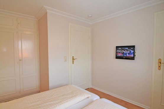 1. Schlafzimmer mit bequemen Boxspringbett (180x200 cm) sowie ein geräumiger Kleiderschrank, der ausreichend Platz für Ihre Kleidung bietet. Das