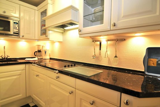 Die separate moderne Hochglanzküche ist mit einer Granitarbeitsplatte, einem Cerankochfeld, einem Geschirrspüler, einer Filterkaffeemaschine und allen Annehmlichkeiten ausgestattet, die Sie für die Zubereitung Ihrer Lieblingsspeisen benötigen.