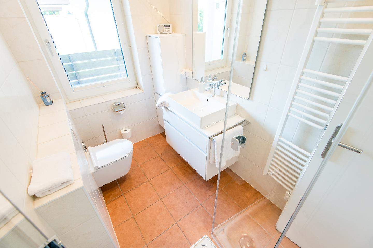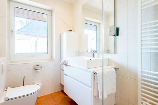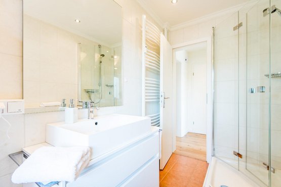 1. Badezimmer (Duschbad) mit großer Dusche, Handtuchheizkörper, großem Spiegel und Fön.