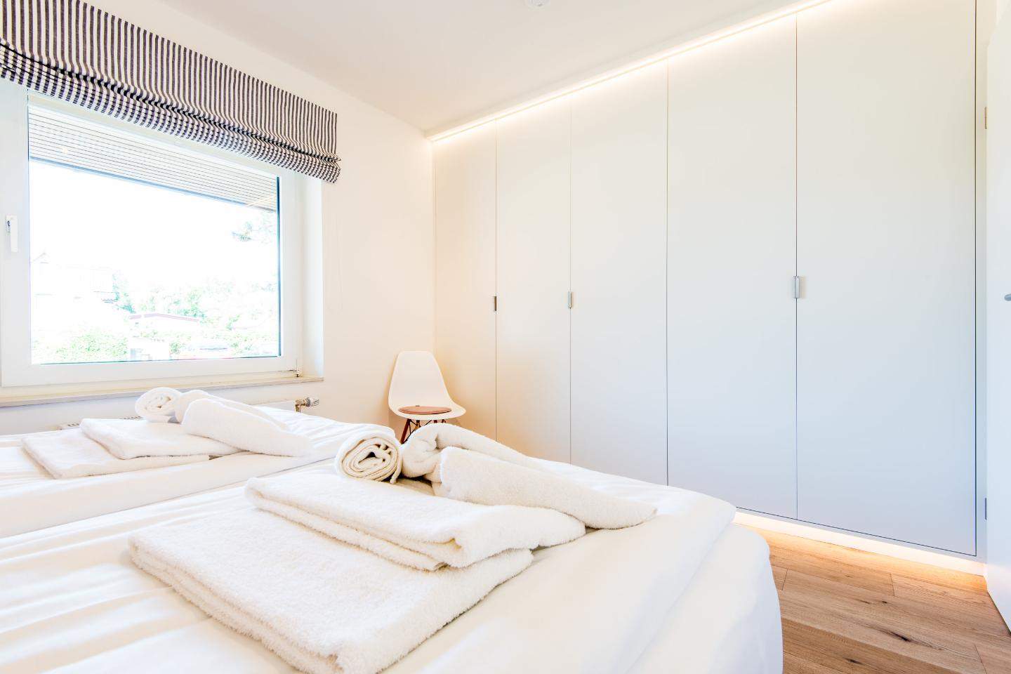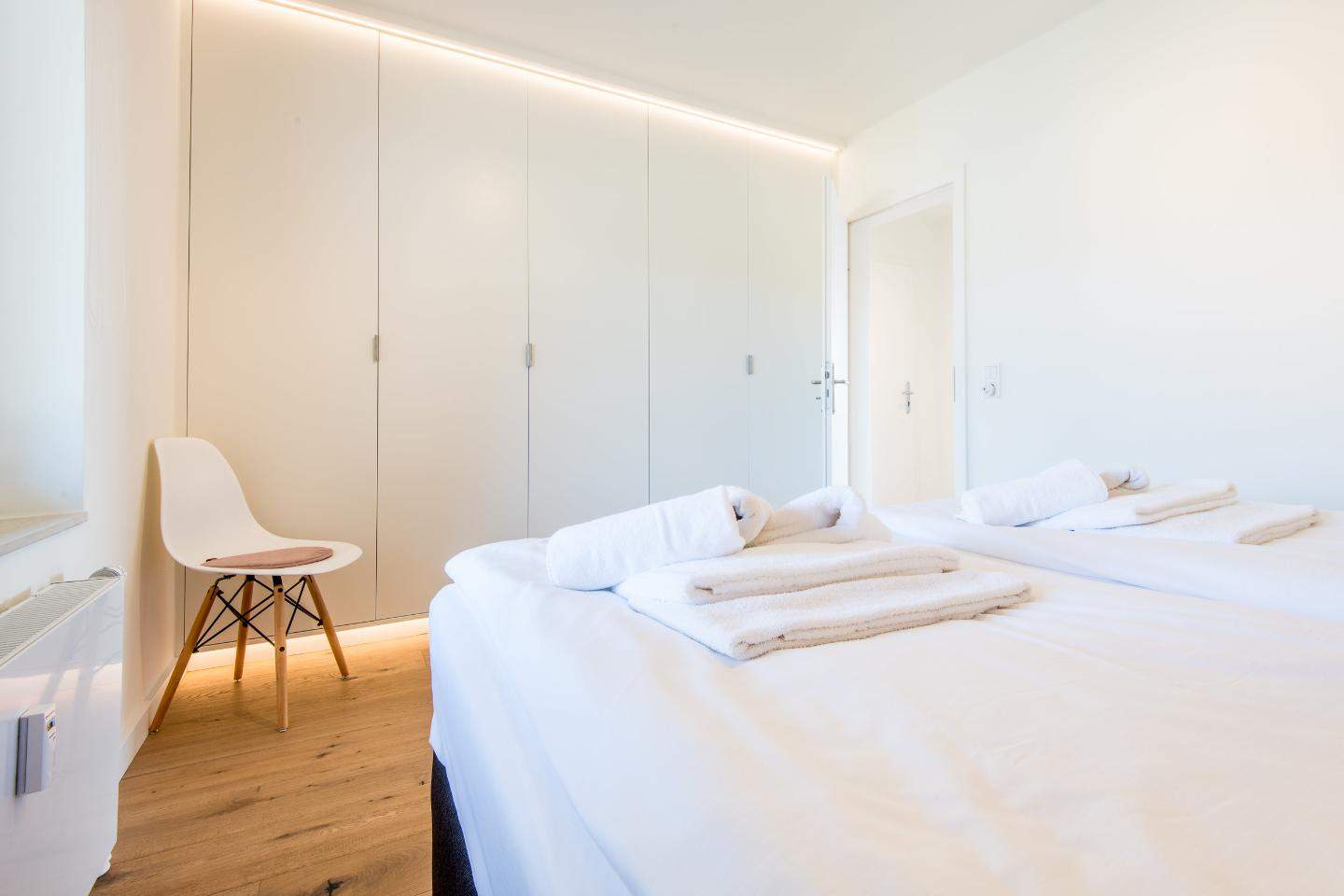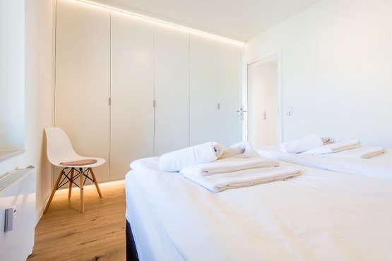 1. Schlafzimmer mit Boxspring-Bett (180x200cm) mit großen Schränken und Flatscreen-TV.