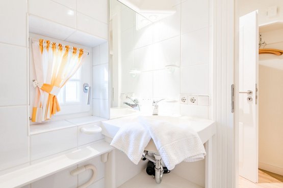 Badezimmer (Duschbad) mit Dusche, WC, Föhn und Tageslicht.