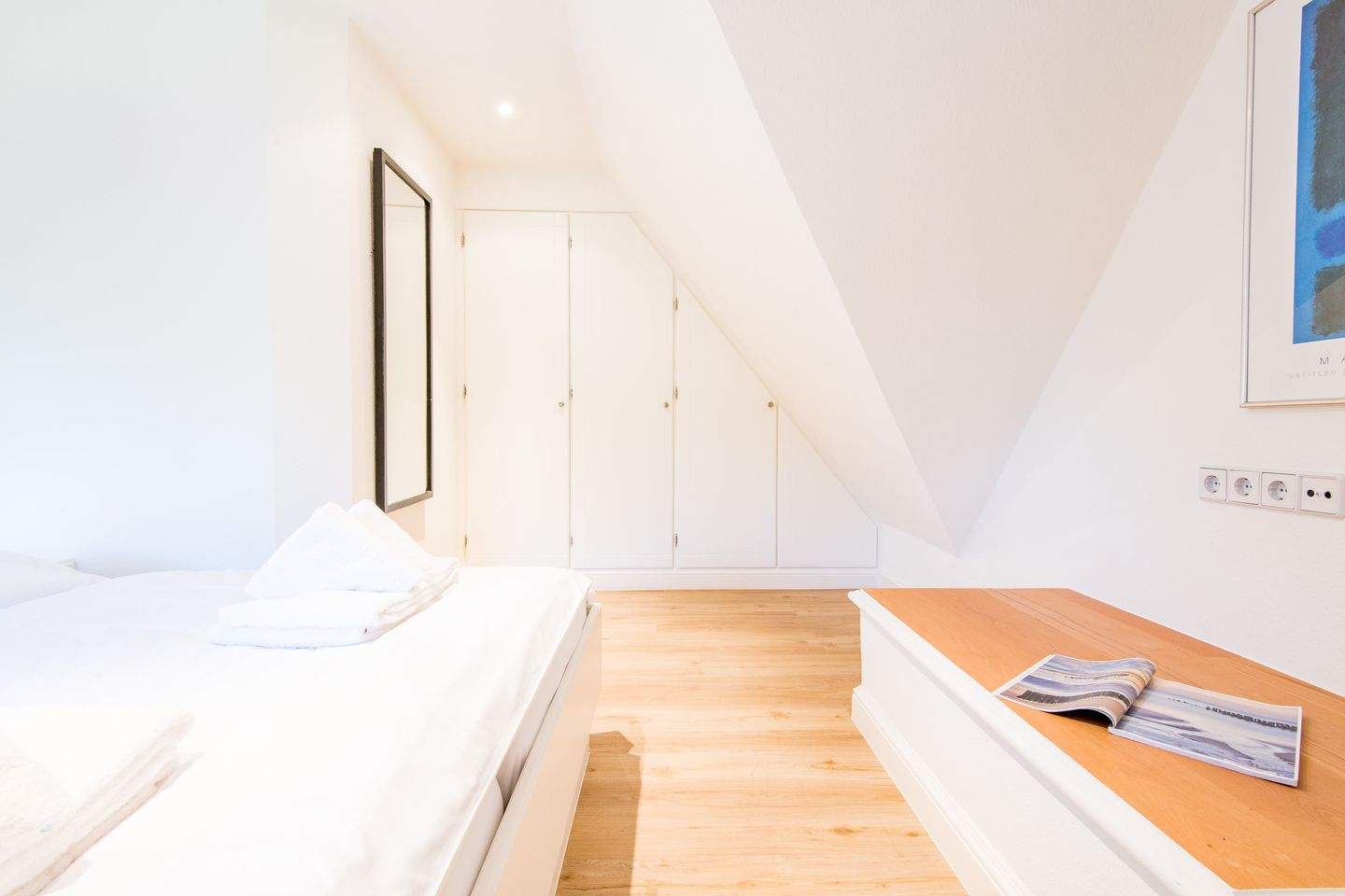 Schlafzimmer mit Doppelbett (180x200cm) und großzügigen Einbauschränken.